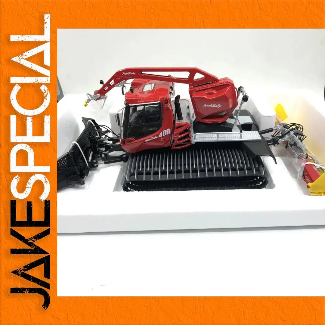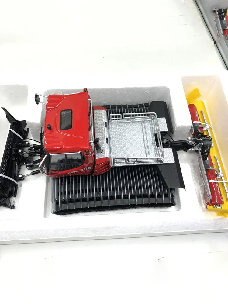 The diecast model of a German snowcat snow plow is a striking 1/32 scale replica that perfectly captures the essence of real snow-plowing machinery. Drenched in vibrant red, with sophisticated black and metallic accents, this model blends aesthetic beauty with authentic detailing. The cab, featuring large windows, showcases the model number “400” alongside the brand designation. This collectible piece also boasts a realistic black track system, an adjustable snow plow blade, and a red hopper that adds functionality. Ideal for collectors, this stunning model not only stands out in any display but also tells a story of snow maintenance craftsmanship.