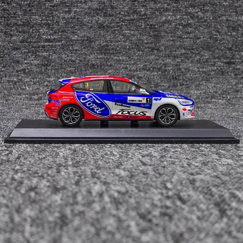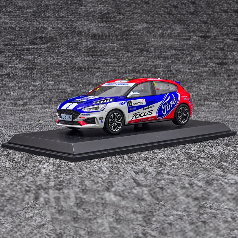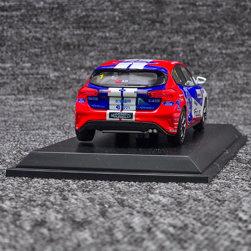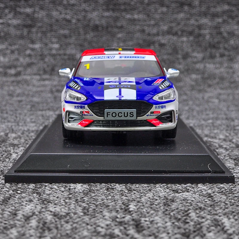 The Diecast 1/32 Scale Ford FOCUS ST Rally Car is a vibrant model showcasing a striking color scheme of red, blue, and white. Crafted from durable metal, alloy, and plastic, it features realistic black rubber tires and detailed wheels. The body is adorned with racing graphics and sponsor logos, prominently displaying the number “1” on the roof and hood, emphasizing its competitive spirit. With a glossy finish that enhances its intricate paintwork, this non-electric model is perfect for collectors and fans alike. The model is designed for display and comes with a base to enhance its collectible appeal.