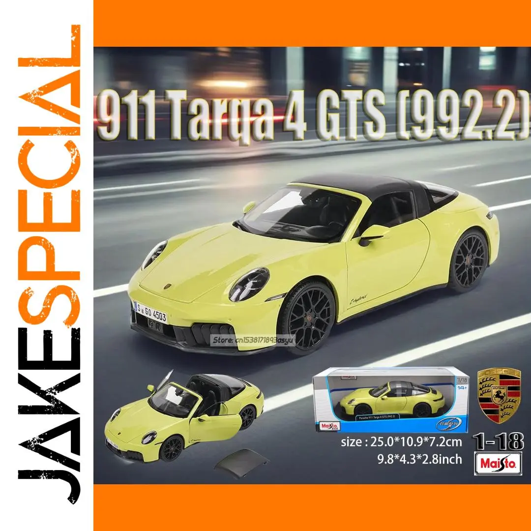 - This 1:18 scale diecast model features a vibrant yellow exterior accented with subtle grey decoration, accurately reflecting the original Porsche 911 Tarqa 4 GTS (992.2). It’s crafted from high-quality metal, plastic, and rubber.