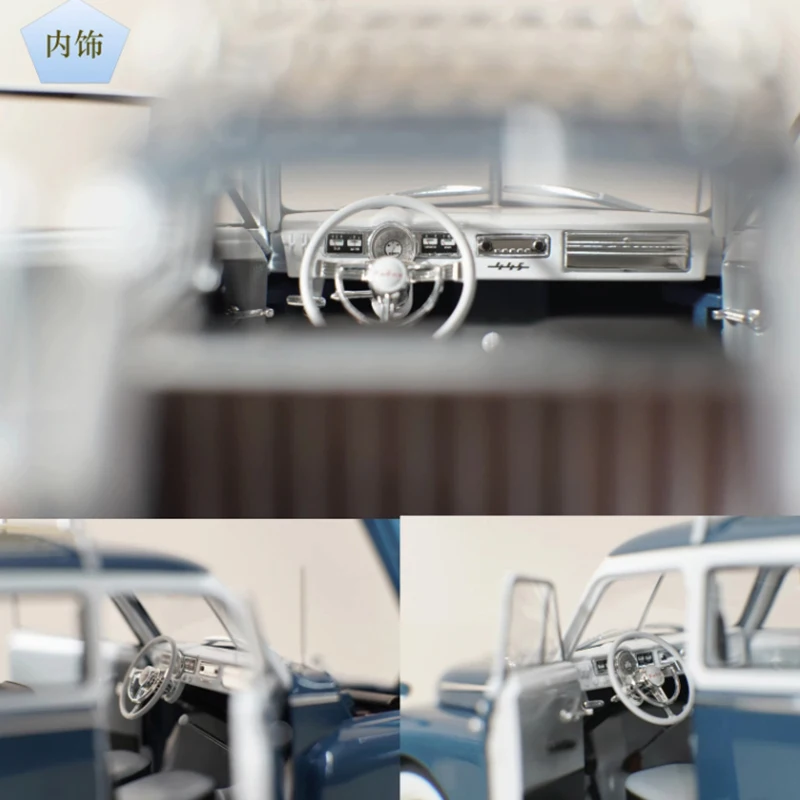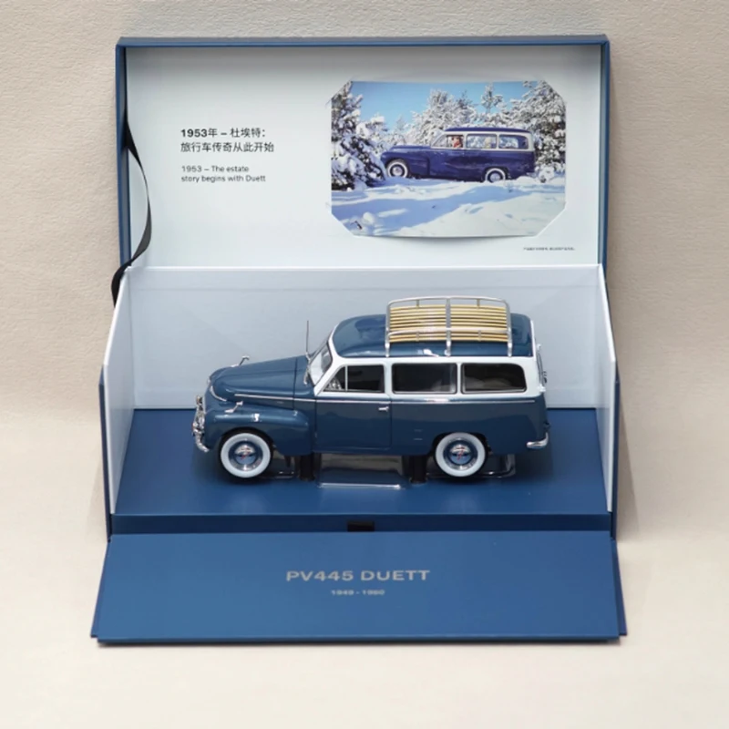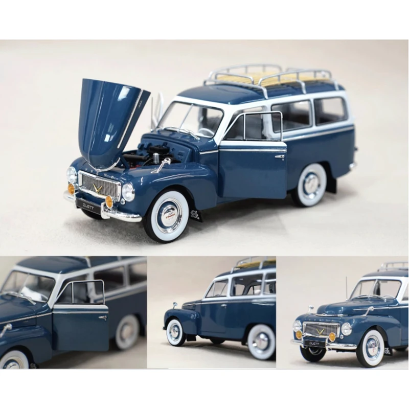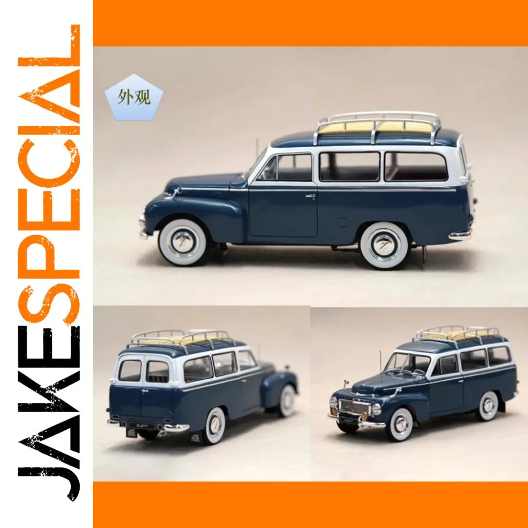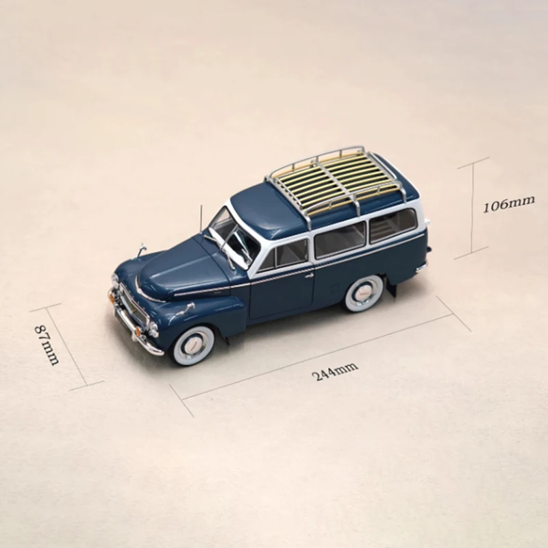 This Vintage Volvo PV445 Duett model beautifully captures the essence of classic automotive design, crafted at a meticulous 1:18 scale. The stunning diecast model measures approximately 24.4 cm in length, 8.7 cm in width, and 10.6 cm in height, making it perfect for any display. Its deep navy blue exterior, enhanced by shiny silver accents, appeals to both car enthusiasts and collectors alike. Attention to detail shines through with features like the chrome-like grille and white-walled tires, complemented by a functional roof rack with a light yellow wooden platform. This model is a perfect addition to your collection, evoking nostalgia and admiration.