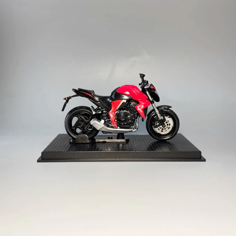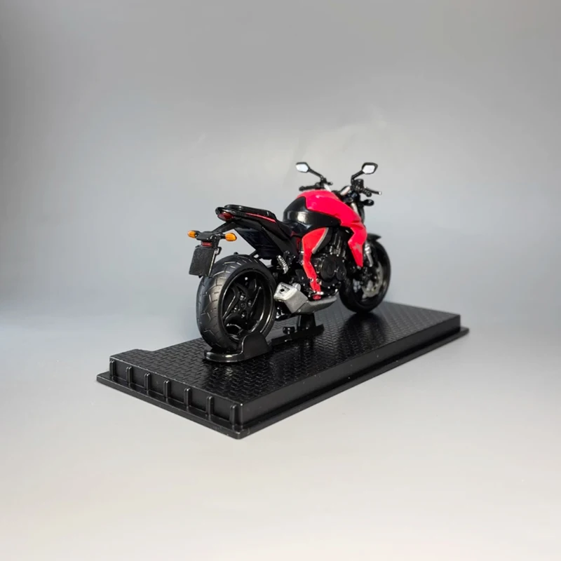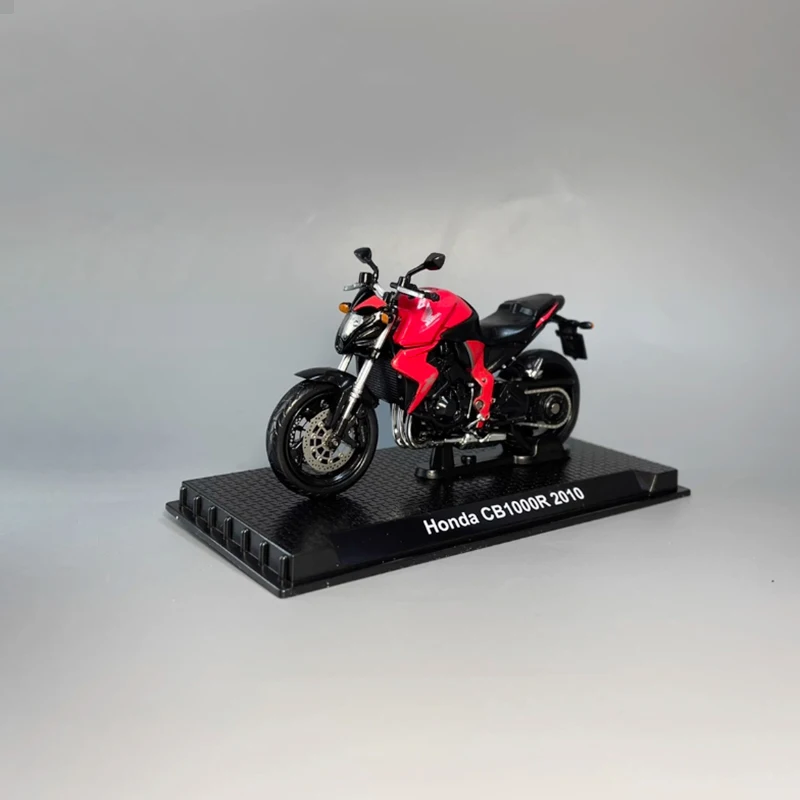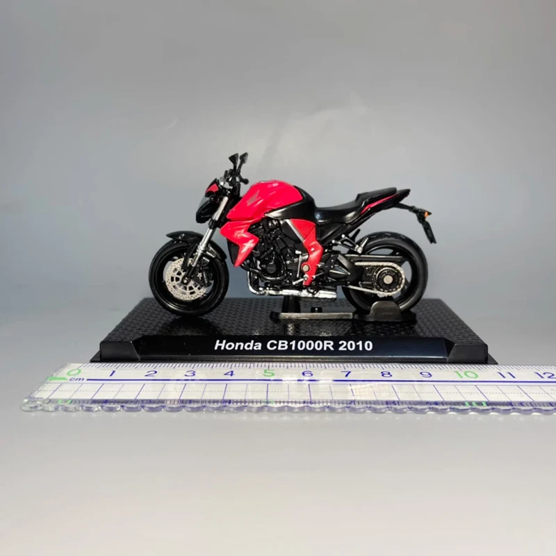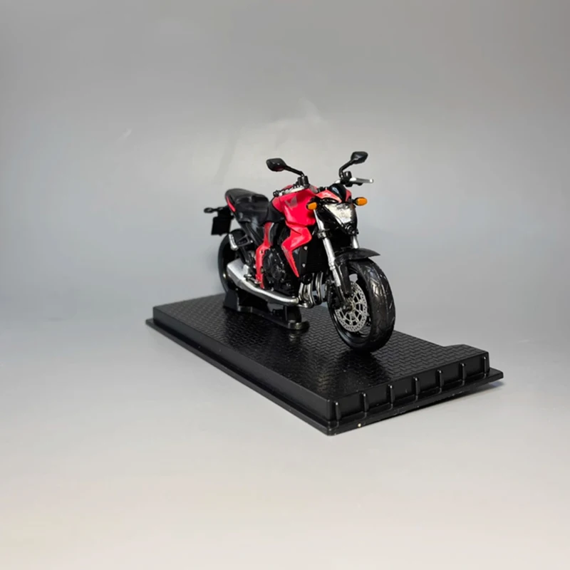 This stunning diecast model of the 2010 Honda CB1000R motorcycle is crafted at a scale of 1:24 and made from high-quality alloy material. The vibrant red finish, accented with sleek black details, beautifully highlights the intricate designs of the headlights, handlebars, and exhaust pipe. The model features realistic wheels with detailed spokes and a matte finish on the tires, reinforcing its sporty character. Ideal for collectors and display enthusiasts, this piece showcases your passion for motorcycles. Enjoy its elegance on the textured black display base, complemented by a label that proudly reads “Honda CB1000R 2010.”