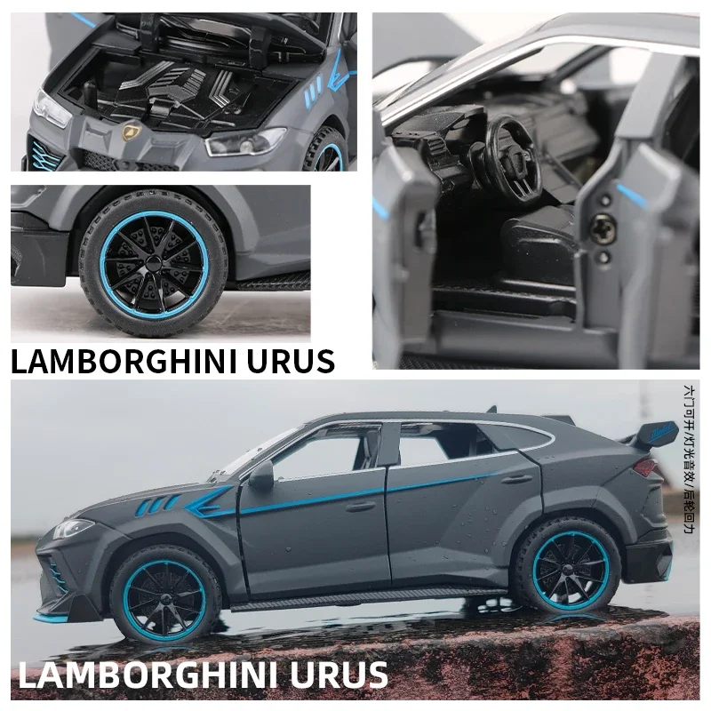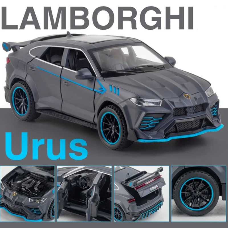 This stunning 1:32 scale Lamborghini Urus diecast model is a collector's dream, showcasing the iconic SUV's sleek and sporty design. Featuring a captivating matte grey exterior enriched with striking blue accents, this mini masterpiece captures the essence of luxury and performance. The attention to detail is impeccable, presenting sharp lines and contours that reflect the real vehicle perfectly. Open the doors to reveal a detailed interior, and watch as the pull-back mechanism brings this model to life. Whether on display or played with, this Lamborghini Urus brings a piece of automotive excellence right into your home.