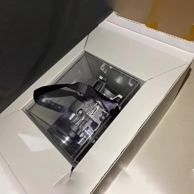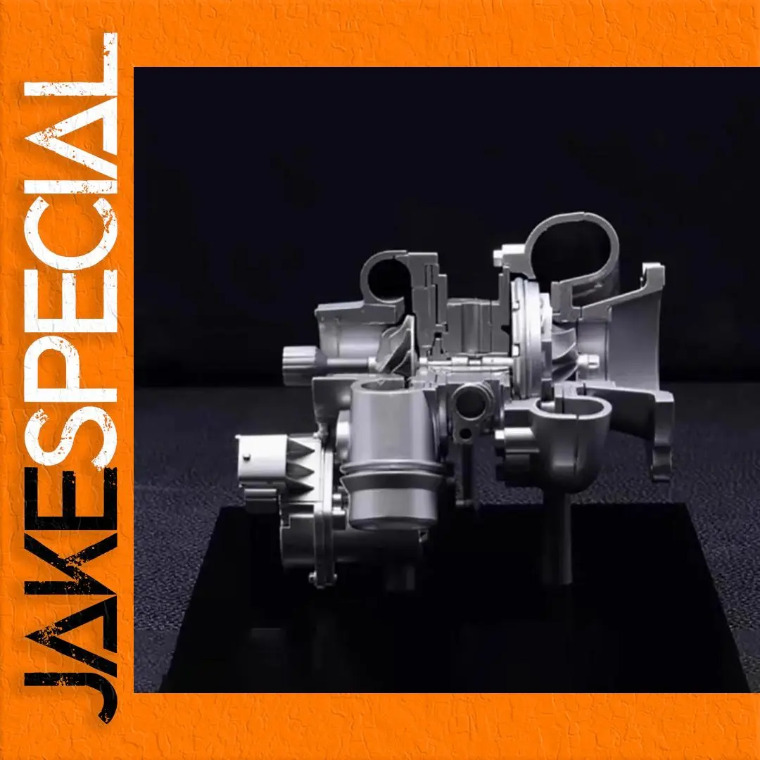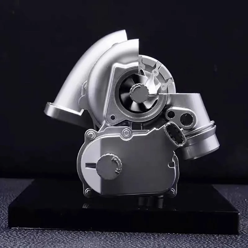 This diecast model of the 911 Turbo VTG turbocharger engine is a must-have for any serious collector or automotive enthusiast. Crafted in a 1:4 scale from high-quality alloy and plastic, its striking metallic silver finish captures the essence of a real turbocharger. The intricate detailing, including cylindrical sections, flanges, and textured engravings, showcases the expert craftsmanship involved in the design. Elegantly mounted on a sleek black base for display, this model serves as a stunning conversation piece or a gift for those who appreciate automotive excellence. Enjoy the artistry of this static display model, perfect for enhancing any personal collection or decorative setting.