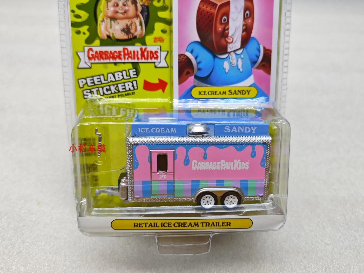The vibrant diecast model of a retail ice cream trailer is designed in a playful style, showcasing pastel pink, light blue, and white colors. It features whimsical ice cream-themed graphics, with bold lettering reading “ICE CREAM SANDY” on top and “GARBAGE PAIL KIDS” on the side. Made from durable metal, this 1:64 scale model is perfect for collectors and decorative purposes. It has a polished metallic surface and mock black windows for added realism, mounted on sturdy black plastic wheels. An ideal piece to enhance any collection or as a charming gift, evoking a sense of nostalgia and fun.