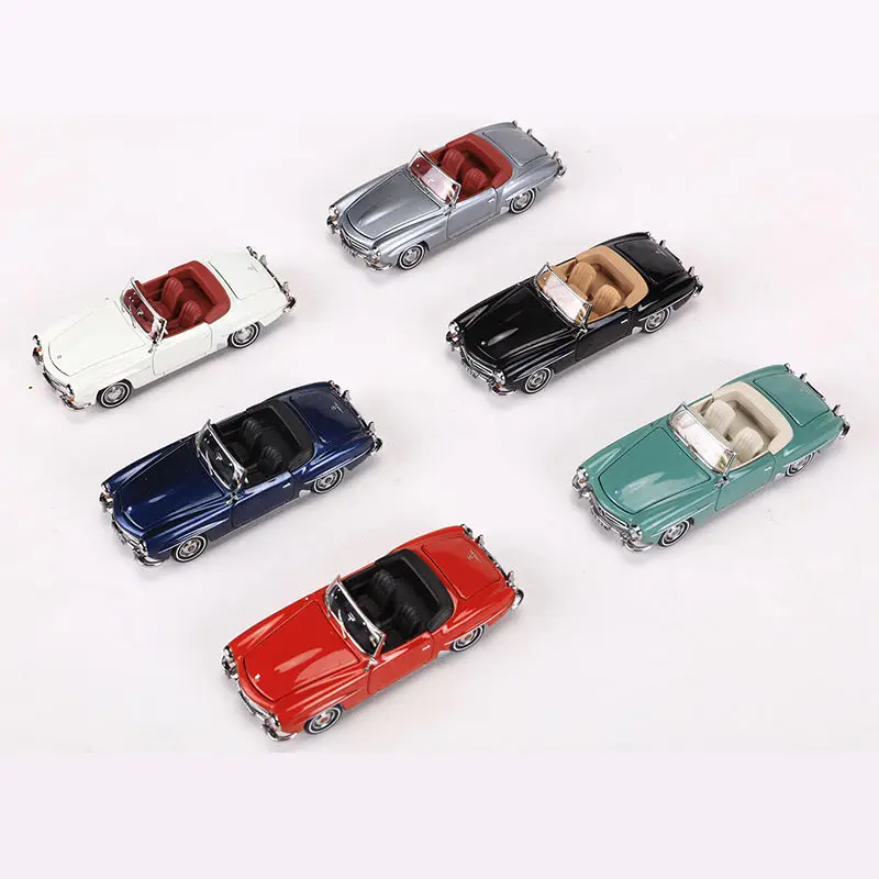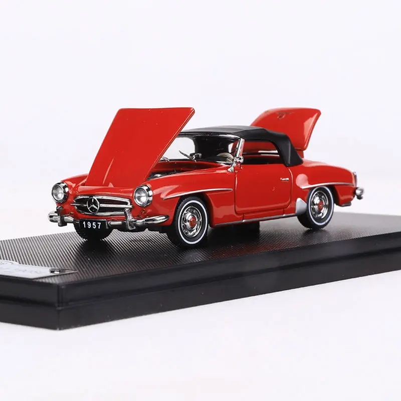 This stunning diecast model of the 1957 Mercedes-Benz 190 SL captures the essence of vintage elegance in a compact form. Finished in a striking vibrant red, it features a classic black soft-top convertible roof that enhances its timeless appeal. Intricate detailing, including a silver chrome front grille and accurately sculpted headlights, creates a lifelike presentation. The model also showcases detailed wheels with chrome accents. With the hood poised open to reveal a carefully crafted engine compartment, each aspect of this piece reflects meticulous craftsmanship. Perfect for display, as a gift, or for collector enthusiasts, it's an instant classic for anyone looking to celebrate automotive history.