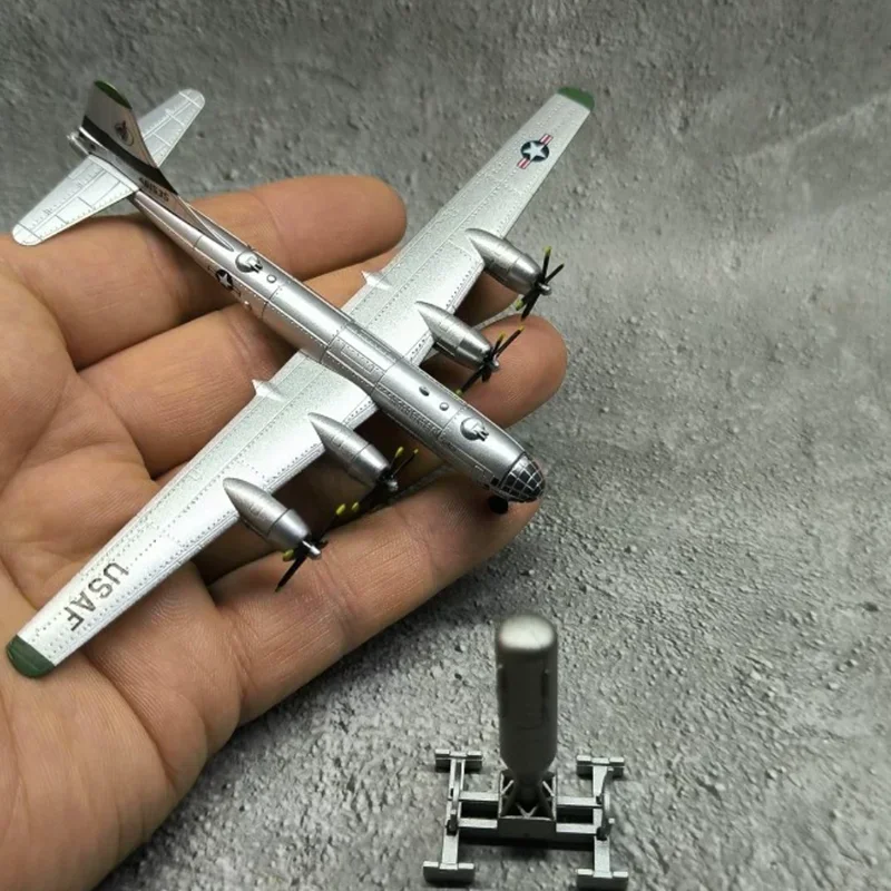 Imagine owning this stunning B-29 Superfortress replica, meticulously crafted with a sleek metallic silver finish that captures the aircraft's authentic appearance. Measuring approximately 10 centimeters in height and 15 centimeters in length, this 1:300 scale model features detailed wings with intricate panel lines, broad and slightly swept-back for a true-to-life look. The black propeller blades with neon yellow tips add a striking contrast, accentuating the mechanical precision. The rounded nose, molded cockpit windows, and fin-like tail stabilizers enhance its aerodynamic and realistic profile. Perfect for display enthusiasts, this model brings history alive in a sophisticated, polished design, adding depth to any collection of aviation memorabilia.