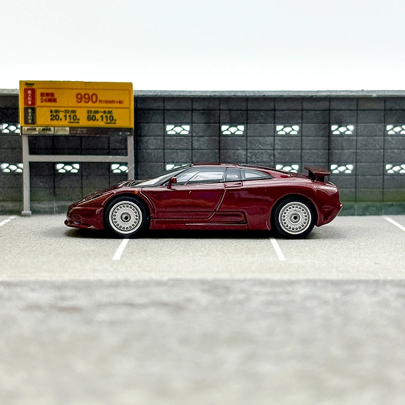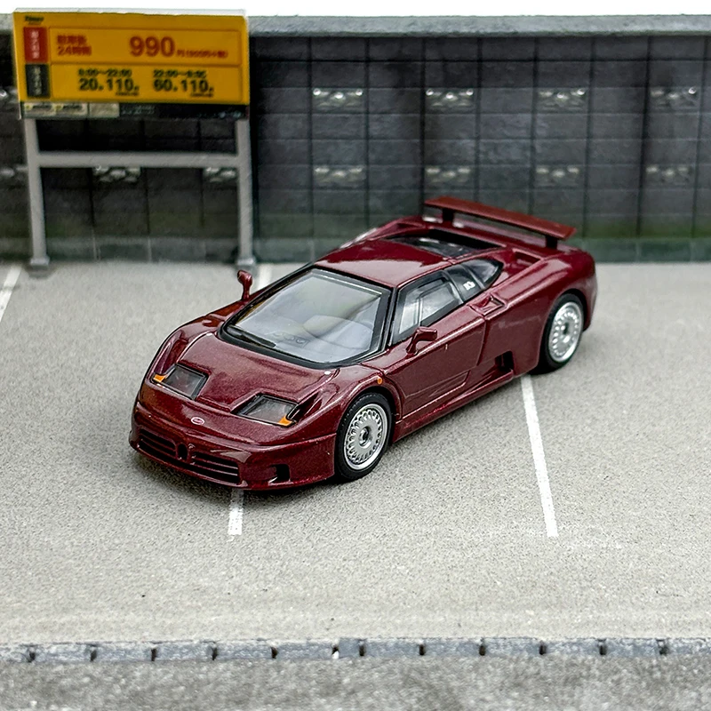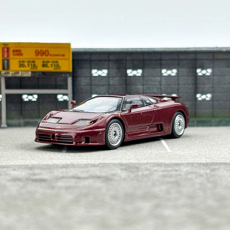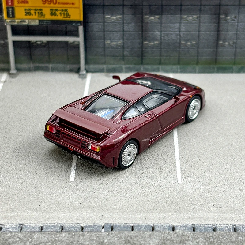 This diecast model car offers an exquisite 1/64 scale replica of the iconic Bugatti EB110 GT, crafted in a sophisticated dark red metallic finish that gleams in the light. The model's sleek design features elegant curves and sharp edges synonymous with high-performance sports cars. Attention to detail is evident in the low front grille, integrated headlights, and stunning five-spoke alloy wheels. Its clear plastic windows allow a glimpse into the interior, while elements like side mirrors and a rear spoiler underscore its sporty aesthetics. Ideal for collectors, this model is both a decorative piece and a conversation starter in your collection.