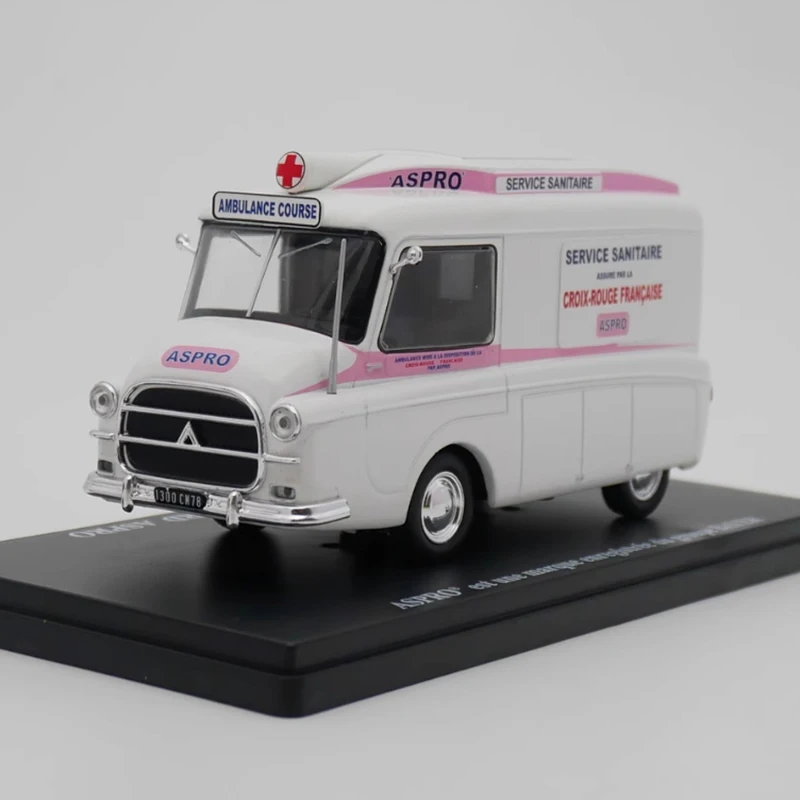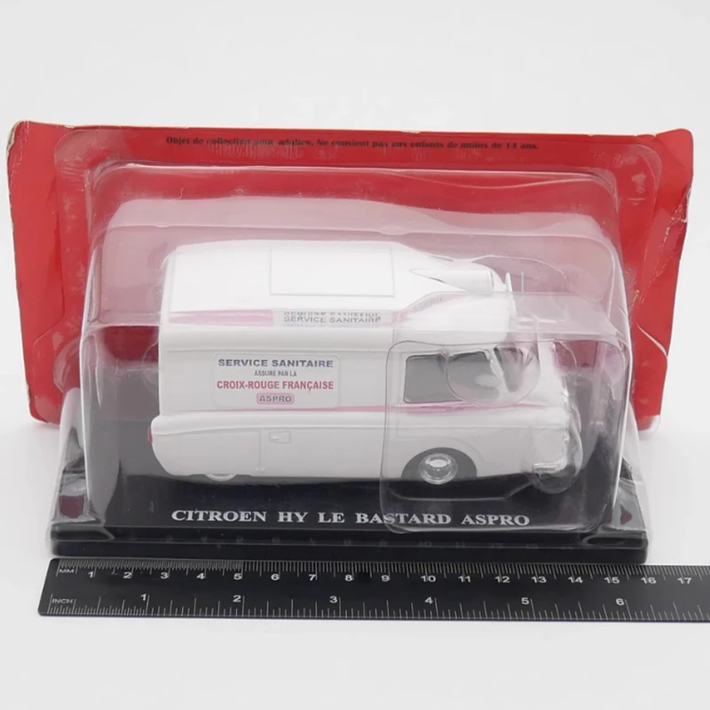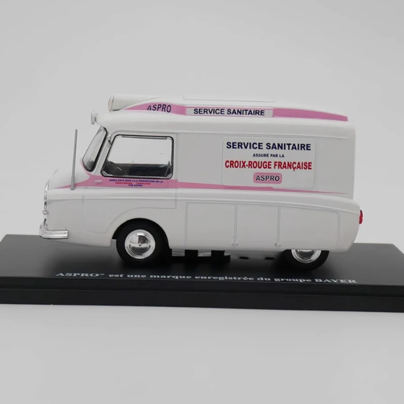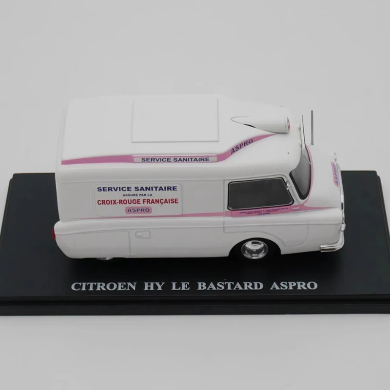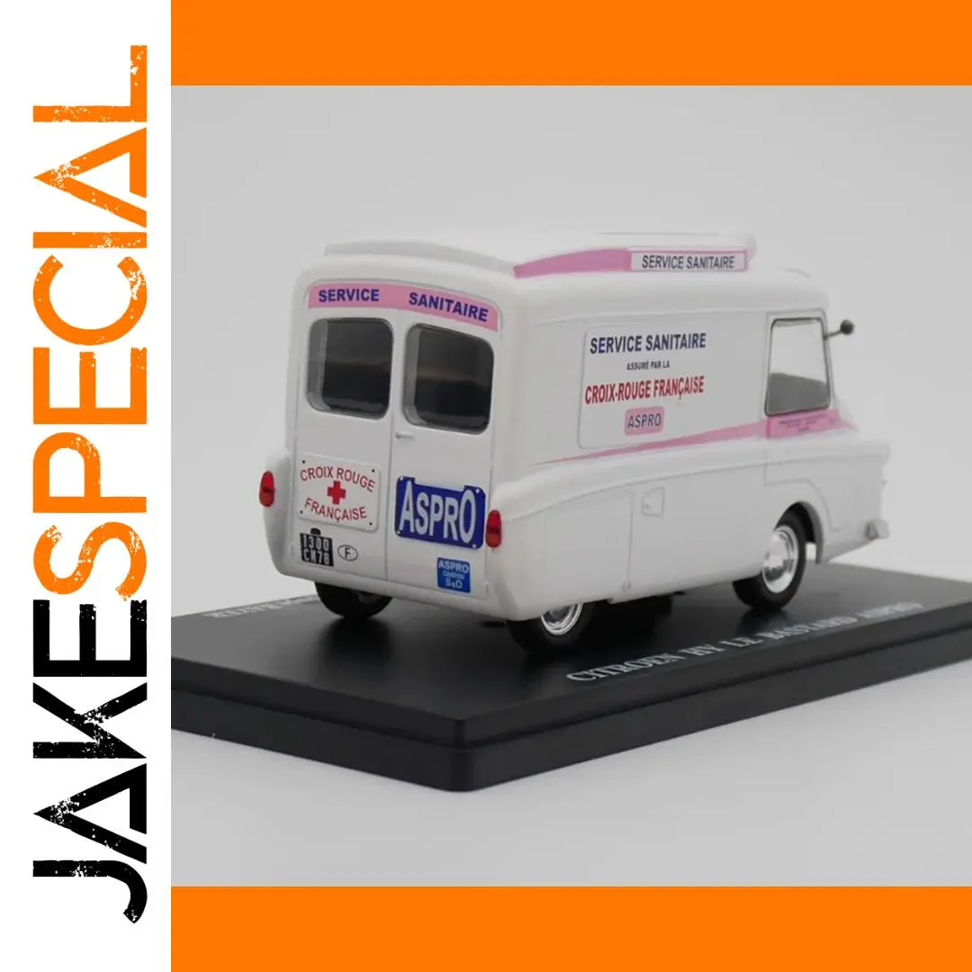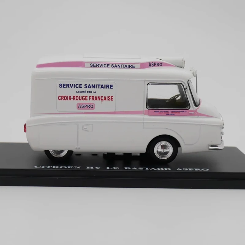 The IXO Diecast Alloy 1/43 Scale Citroen Type HY Van model showcases a charming vintage aesthetic with a white body accented by pink details, such as “SERVICE SANITAIRE” and “ASSURÉ PAR LA CROIX-ROUGE FRANÇAISE” inscriptions. The model features rounded edges and large windows that reveal a simplified interior. Made from metal alloy, rubber, and ABS plastic, it has functional wheels and realistic black rubber tires. The high-quality paint finish enhances its appeal as a decorative item or collectible. Perfect for display or gifting, this intricate diecast model is a must-have for enthusiasts and collectors alike.