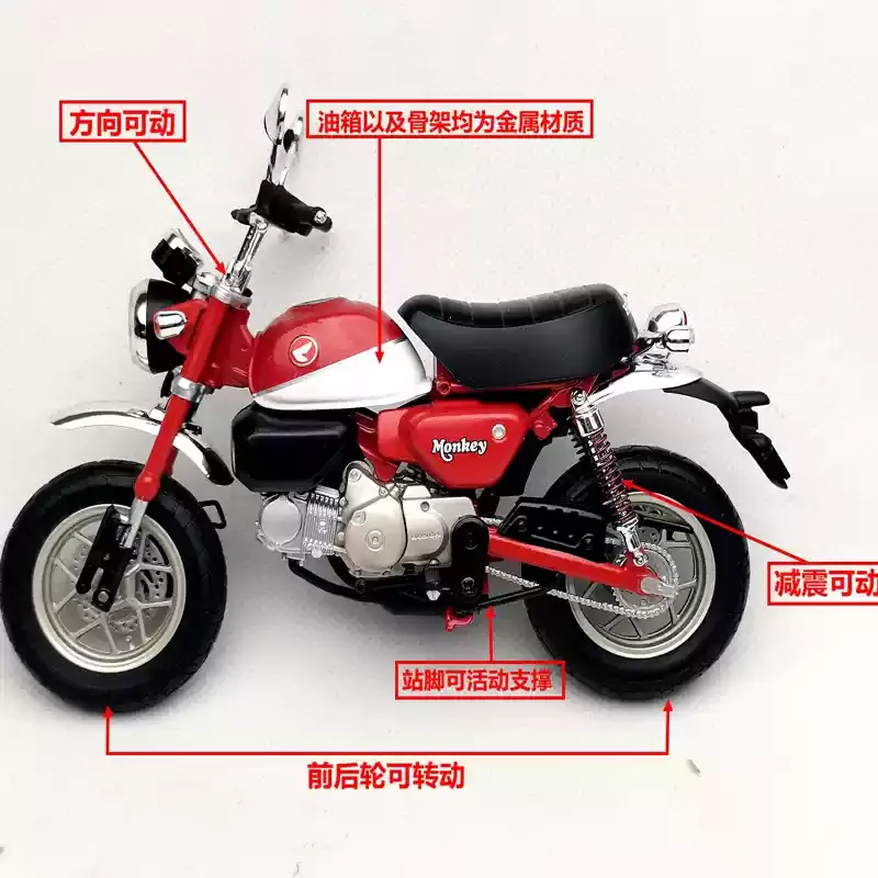 - Authentic 1/12 scale diecast reproduction of Honda Monkey motorcycles.