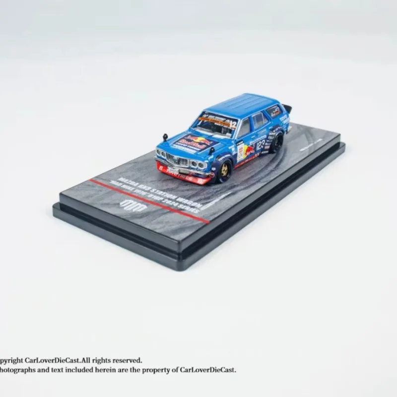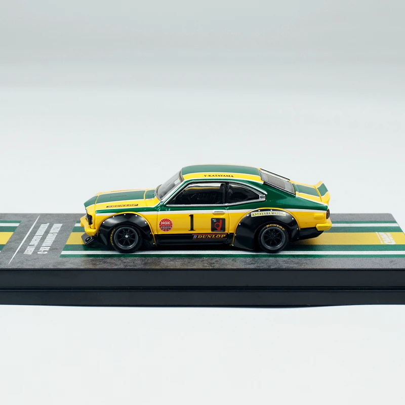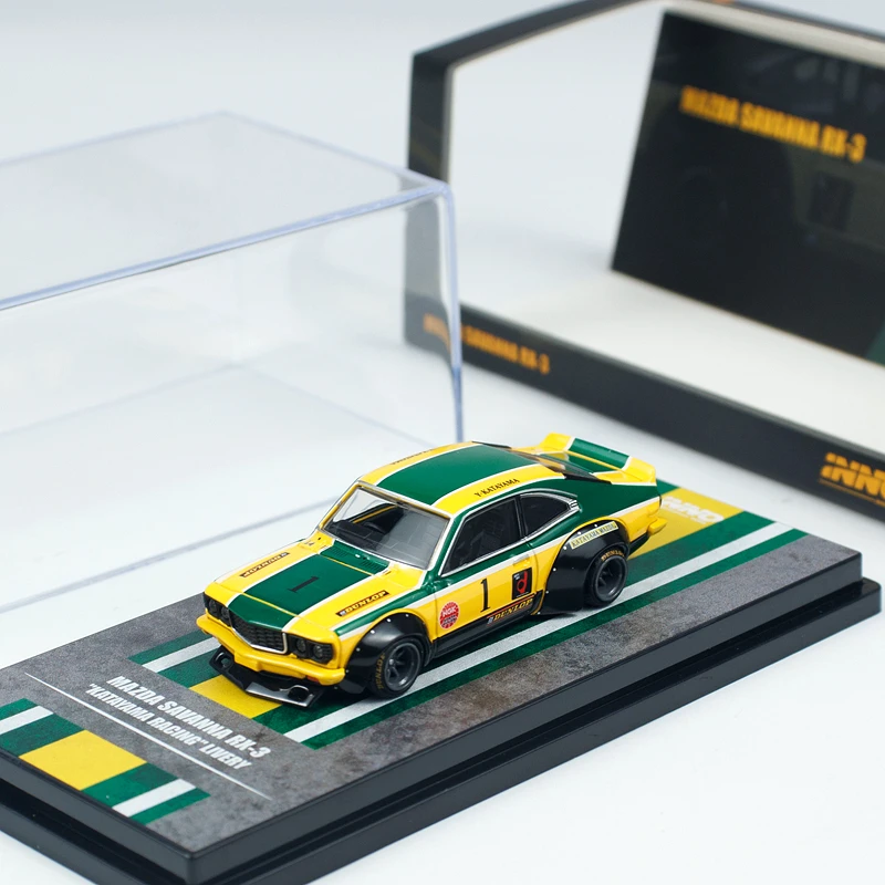 The Diecast INNO 1/64 Scale MAZDA RX3 Station Wagon car model is a stunning replica designed for collectors and enthusiasts. The model boasts a sleek blue finish with racing decals, including the prominent number “12” and intricate detailing like the classic front grille and headlights. Its elongated station wagon body style is complemented by reflective glossy paint and stylish black wheels with gold rims, enhancing its sporty aesthetic. Alongside it is the MAZDA RX3 coupe, adorned with bright yellow and green accents, perfect for a striking display. Both models are crafted from metal, alloy, and plastic, showcasing exceptional detail and the vibrant essence of Mazda's legendary cars.
