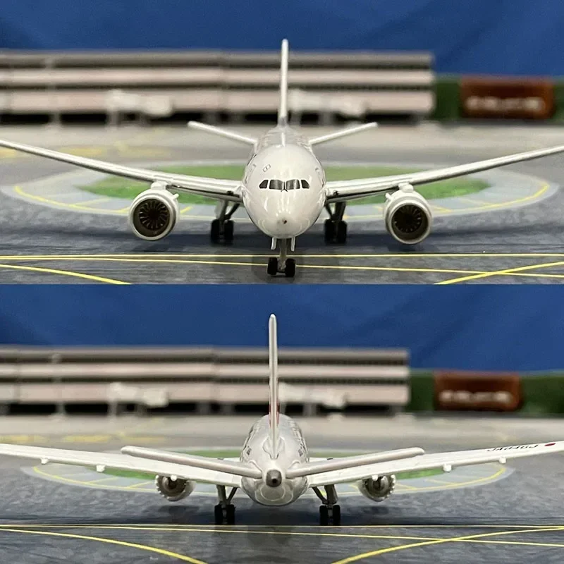 Imagine showcasing this stunning Diecast 1:400 Scale Japan Airlines B787-8 model in your collection. With its elegant, primarily white fuselage adorned with bold black lettering spelling “JAPAN AIRLINES,” this model captures the essence of the airline's livery. Its meticulous detailing, including a red emblem featuring a stylized crane on the tail, perfectly reflects the iconic branding. The model's realistic features, from the engines mounted beneath slightly upward wings to the accurately crafted cockpit area with windows, are sure to impress any aviation enthusiast. Constructed from durable metal and plastic, this polished piece is a visual delight, designed specifically for adult collectors and enthusiasts to admire and display.