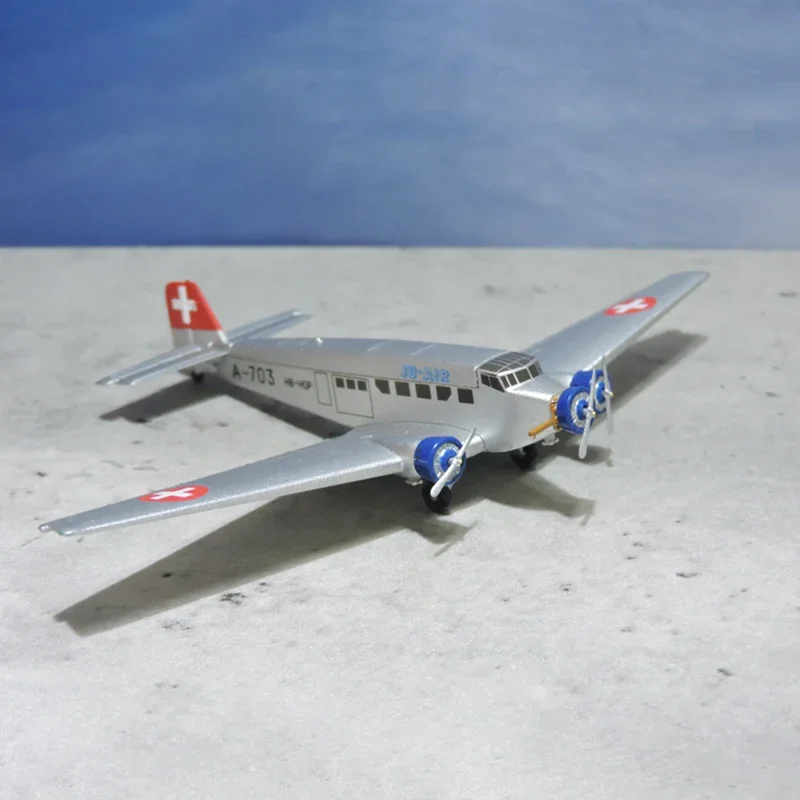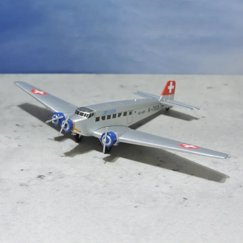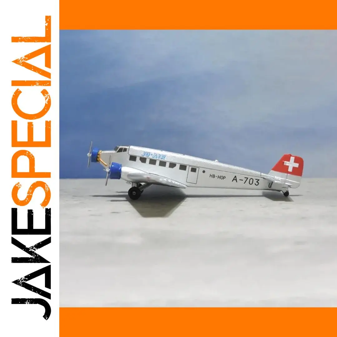 Bring home a meticulously crafted 1:200 scale diecast model of the iconic Junkers Ju-Air JU52 aircraft, measuring approximately 9.5 centimeters in length with a 12-centimeter wingspan. This detailed replica features a sleek metallic silver finish, black registration marks, and a striking red tail adorned with a white Swiss cross, capturing the vintage charm of this classic aircraft. Constructed from durable diecast alloy metal with ABS wings and finely painted details, including a blue engine cowling and tiny gray propellers, it offers an authentic display piece. Perfect for collectors age 14 and above, this non-electric model celebrates aviation history with exceptional craftsmanship and visual appeal.