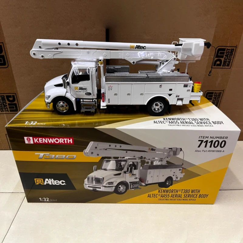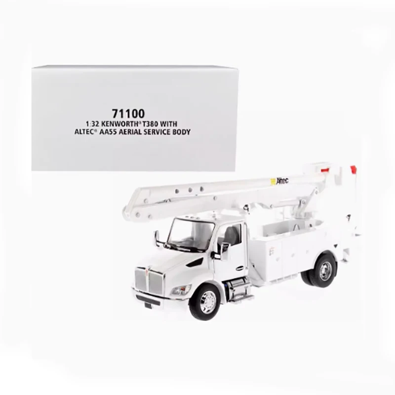 Experience the authentic craftsmanship of this detailed diecast model of the Kenworth T380 ladder truck. Sized at 1:32 scale, this model measures approximately 28 centimeters in length, 10 centimeters in width, and 11 centimeters in height. Its pristine white exterior is accented with silver finishes on the grille and chrome-like details, vividly capturing the look of a real fire truck. The textured surface features compartments, handles, vents, and paneling for added realism. The extendable ladder, also white, includes jointed sections, grooves, and mechanical details that make it stand out. Perfectly crafted for display, this model offers a stunning visual replica that stands out in any collection or as a decorative piece.