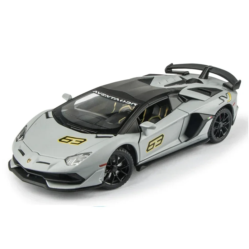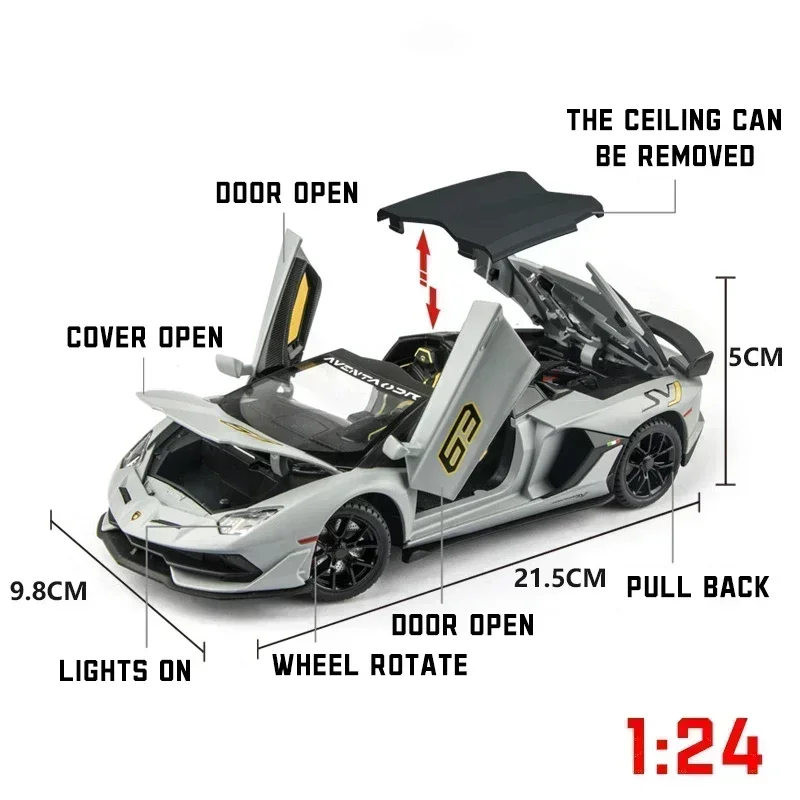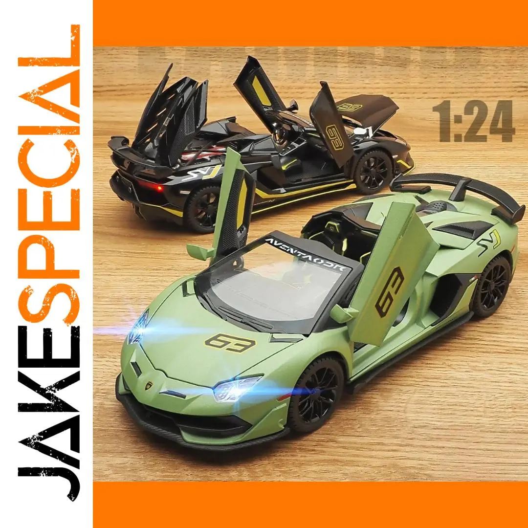 Experience the thrill of owning this meticulously crafted 1:24 scale diecast Lamborghini Aventador SVJ 63 model. Made from high-quality metal alloy, this model captures the aerodynamic curves and sleek silhouette of the real sports car. Available in vibrant colors like lime green, black, grey, and yellow, each with or without the original box, it’s perfect for collectors or enthusiasts. The illuminated headlights with a bright bluish glow and detailed wheel rims add an authentic touch. The scissor doors open upwards, revealing a finely detailed interior, while the glossy finish emphasizes its luxurious appeal. This model is more than just a toy—it’s a display-ready masterpiece that embodies speed, style, and craftsmanship.