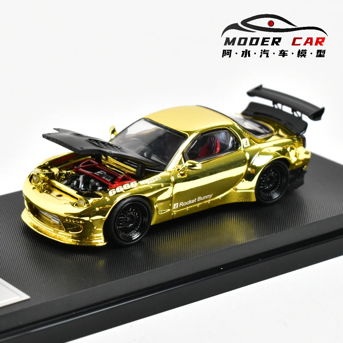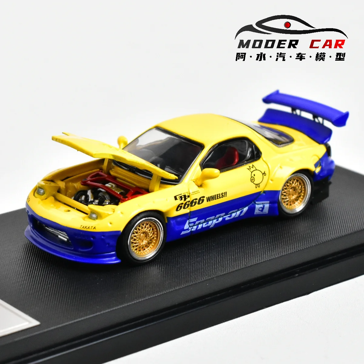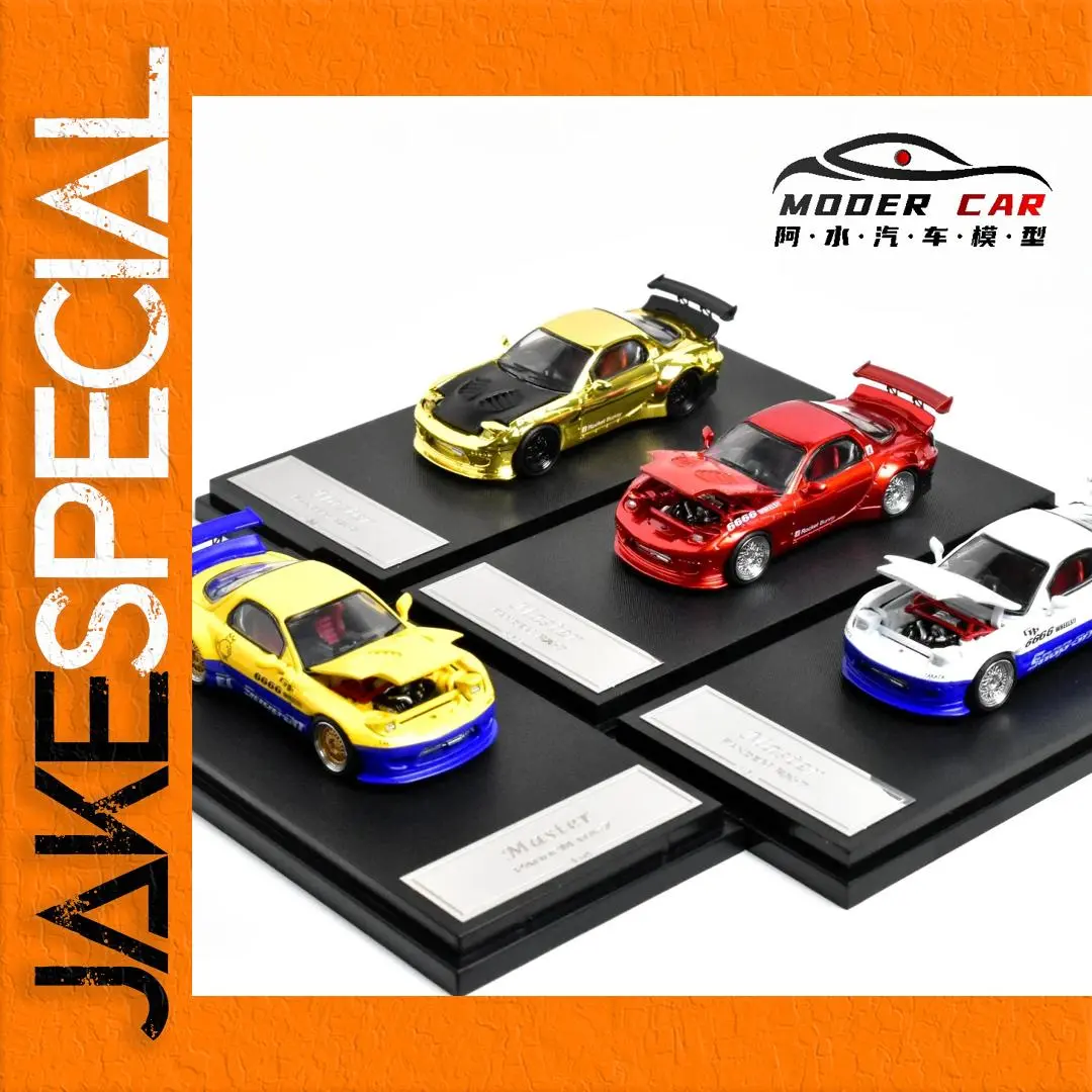 This 1:64 scale diecast model car showcases a Mazda RX7 FD3S available in vibrant colors including metallic gold, bright red, white with blue accents, and yellow with blue detailing. Crafted from durable metal, it offers realistic details with sharply defined sports body lines, prominent rear spoilers, large front splitters, and detailed engine bays visible through open hoods. The model features silver multi-spoke wheels that enhance its high-performance aesthetic, complemented by racing decals and subtle surface textures. Designed for adult collectors, this non-electric, battery-free model emphasizes craftsmanship, realism, and visual impact, making it a striking addition to any collection.