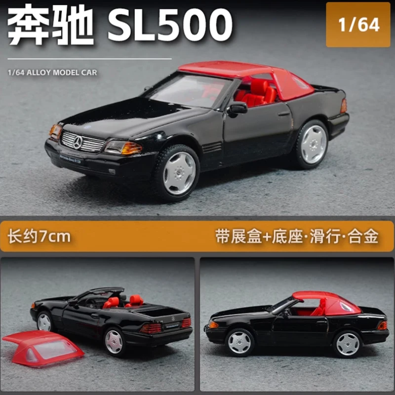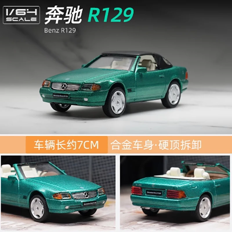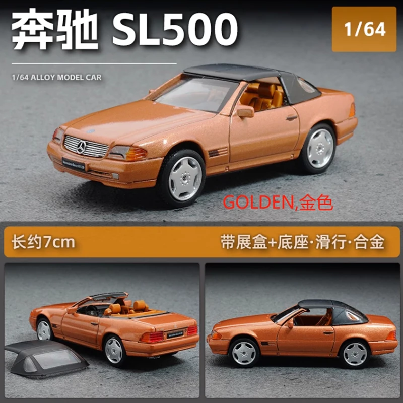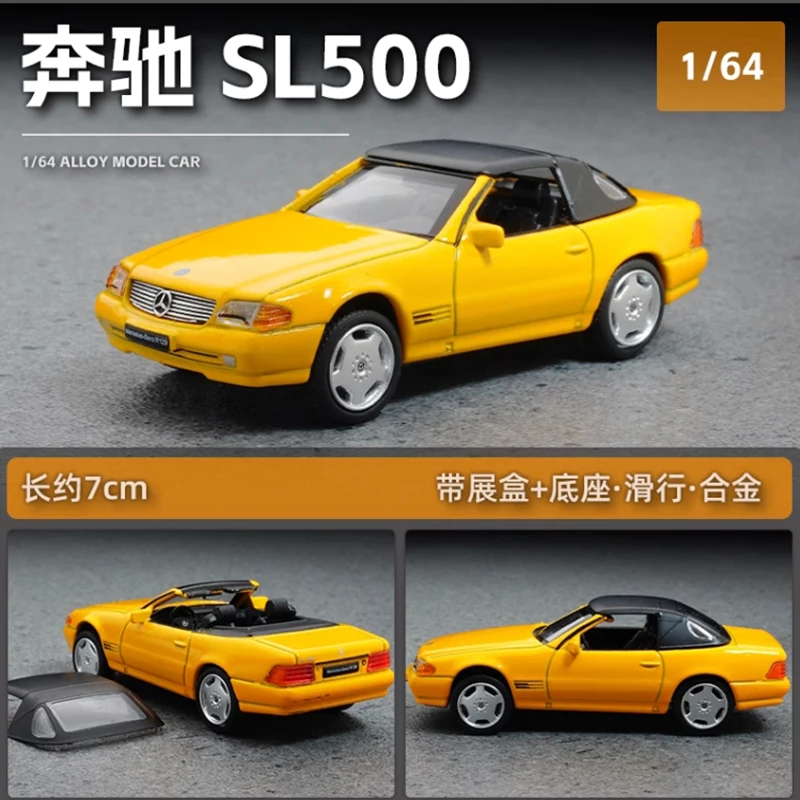 - Meticulously scaled at 1:64, this model presents an accurate replica of the Mercedes-Benz SL500 R129, emphasizing detailed exterior features like grille, headlights, and side mirrors with realistic precision.