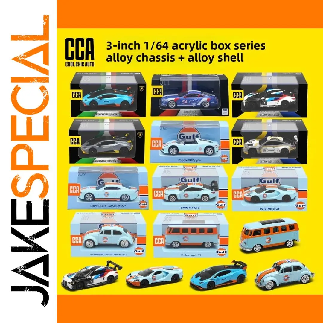 Experience a captivating showcase of miniature vehicles with this exquisite diecast model collection. Crafted with precision, each car is made from durable metal alloy, capturing the sleek design and vibrant colors of iconic brands and models. From the sporty BMW M4 GT3 in black and Gulf liveries to the nostalgic Volkswagen Beetle and vintage T1 van, these models beautifully blend modern aesthetics with retro charm. Displayed in transparent boxes and presented with detailed packaging, these collectibles are perfect for enthusiasts and collectors. Visualize yourself owning this detailed set and adding a dynamic, stylish touch to your space today. The collection offers an impressive variety of automotive history in a compact, meticulously crafted package.