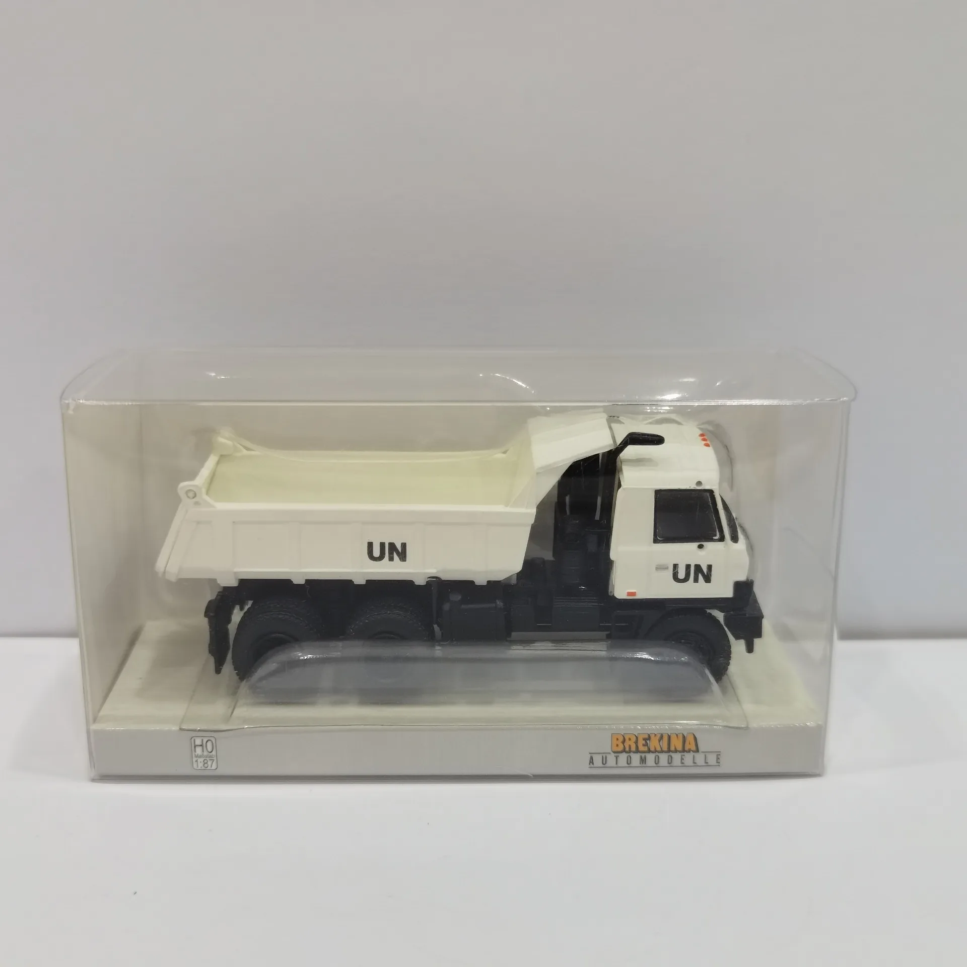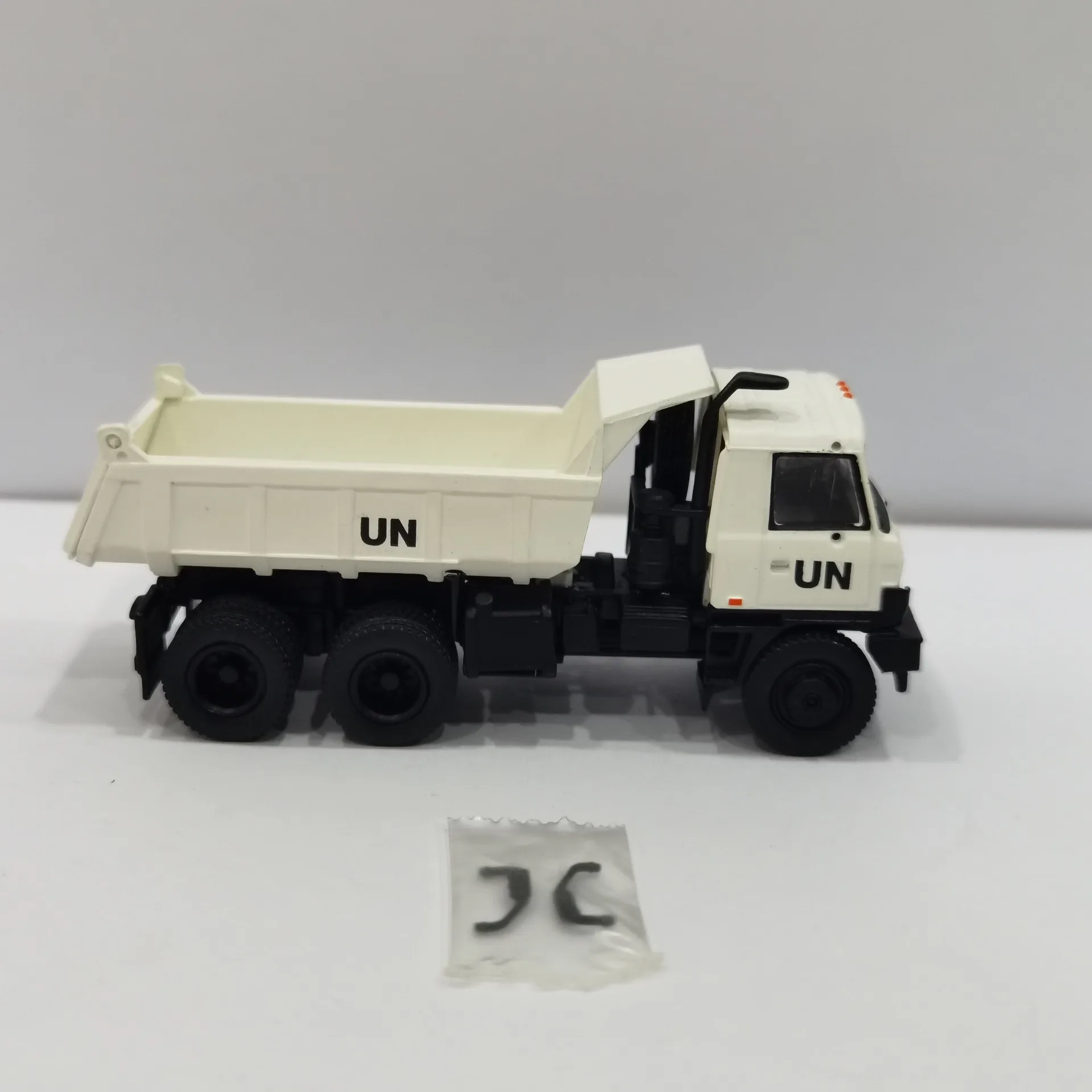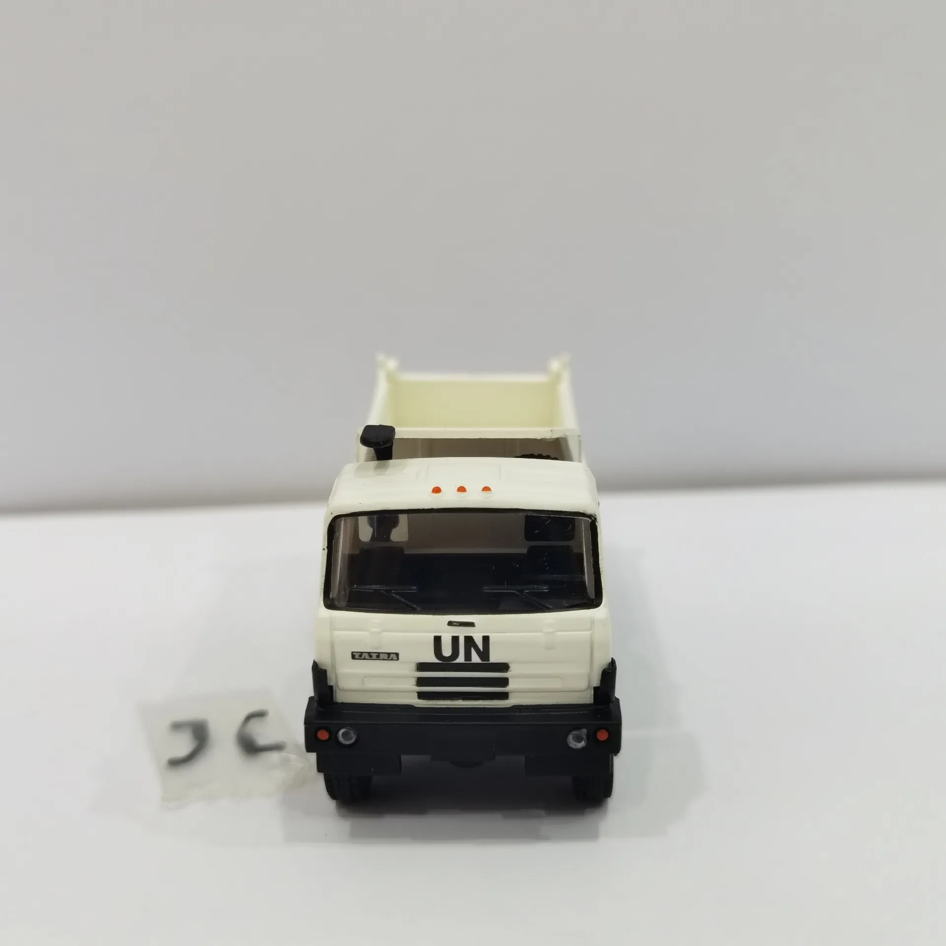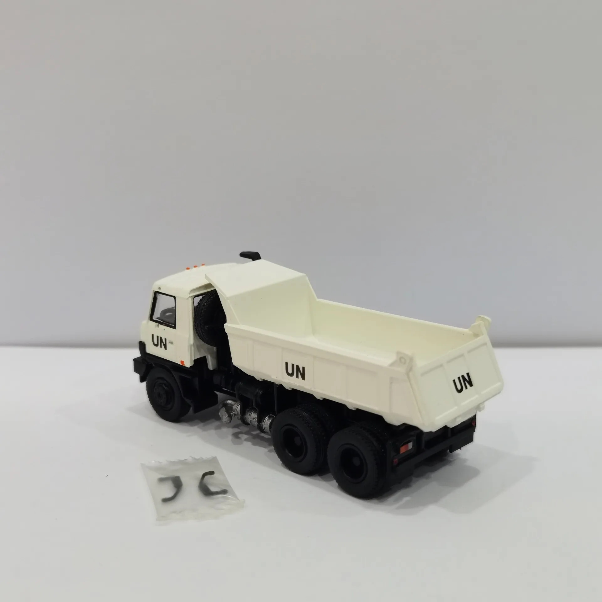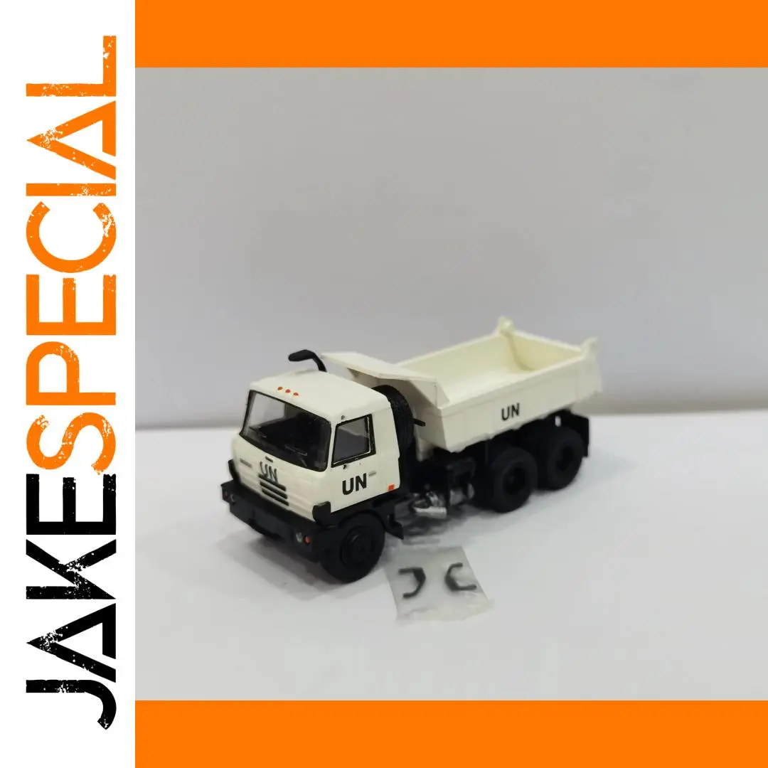 This beautifully crafted diecast model of the Tatra 815 Kipper Too Drag Dump Truck is designed at a 1:87 scale. Its glossy white finish and detailed features bring a touch of realism to your display collection. The robust front cab showcases clear windshields and a black grille, complemented by three small red lights. With the abbreviation “UN” boldly on its sides, this model captures the essence of United Nations vehicle aesthetics. Although the dump bed is non-operational, its sloped design represents the truck's functionality beautifully. Perfect for avid collectors, this stunning piece adds character to any showcase.