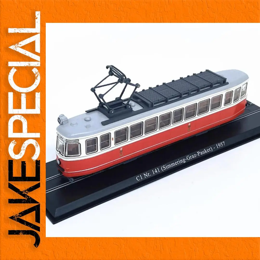 Imagine adding the Diecast Model Tram C1 Nr. 141 (Simmering-Graz-Pauker) from 1957 to your collection! This beautifully crafted piece captures mid-20th century design with its vibrant red body and elegant white accents. Its light grey upper section and large, clear windows give a charming glimpse into the tram's interior. The intricate overhead tram line, featuring a meticulously detailed pantograph, adds an air of realism. Resting on a sleek black base with engraved text, this model is a perfect statement piece for any display or collection. It's crafted from a quality blend of metal and plastic, ensuring durability and exquisite detailing that every collector will appreciate.