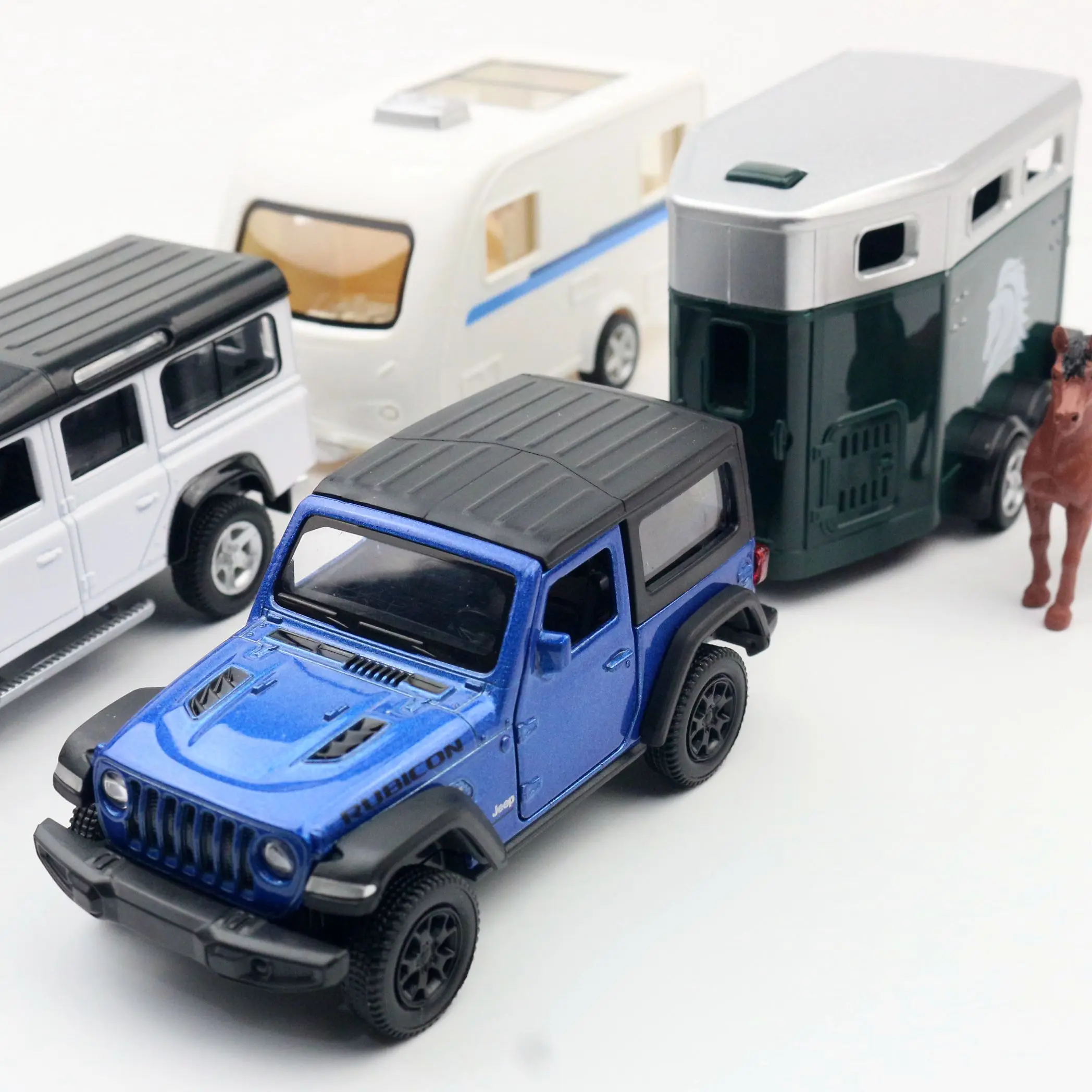 - Various color options include Defender Horse Box, Jeep with Caravan, Ford F-150 Horse Box, and Range Rover Caravan, all featuring contrasting roofs and accent details to enhance realism.