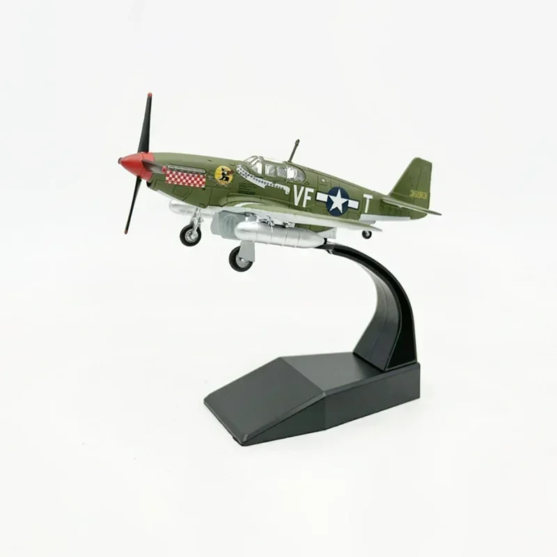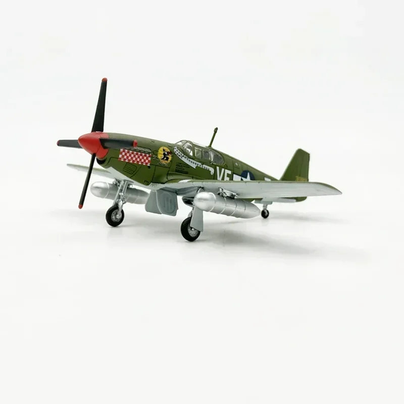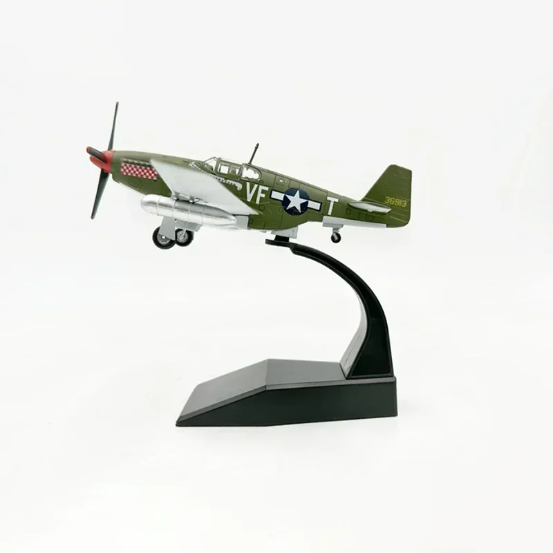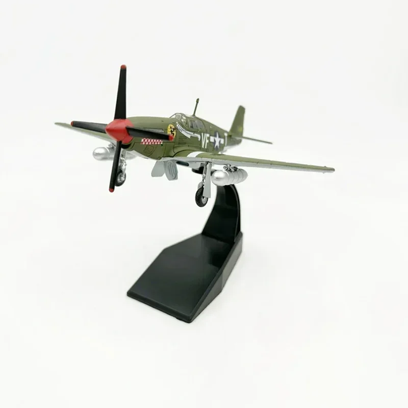 This meticulously crafted 1:72 scale diecast model of the P-51 Mustang fighter plane from 1944 features an olive-green fuselage with a vibrant red-tipped propeller, detailed panel lines, and authentic military markings including white stars with blue circles. Measuring approximately 13.8 cm in length and 15.7 cm across the wingspan, it weighs about 212 grams and is made from alloy metal with a durable ABS base. Perfect for collectors, this finished display model showcases realistic paintwork and fine craftsmanship, capturing the vintage military aircraft’s sleek design and historical authenticity. Ideal for display in a dedicated collection or display case.