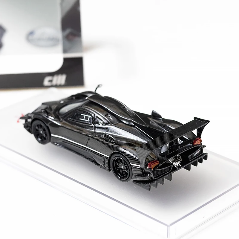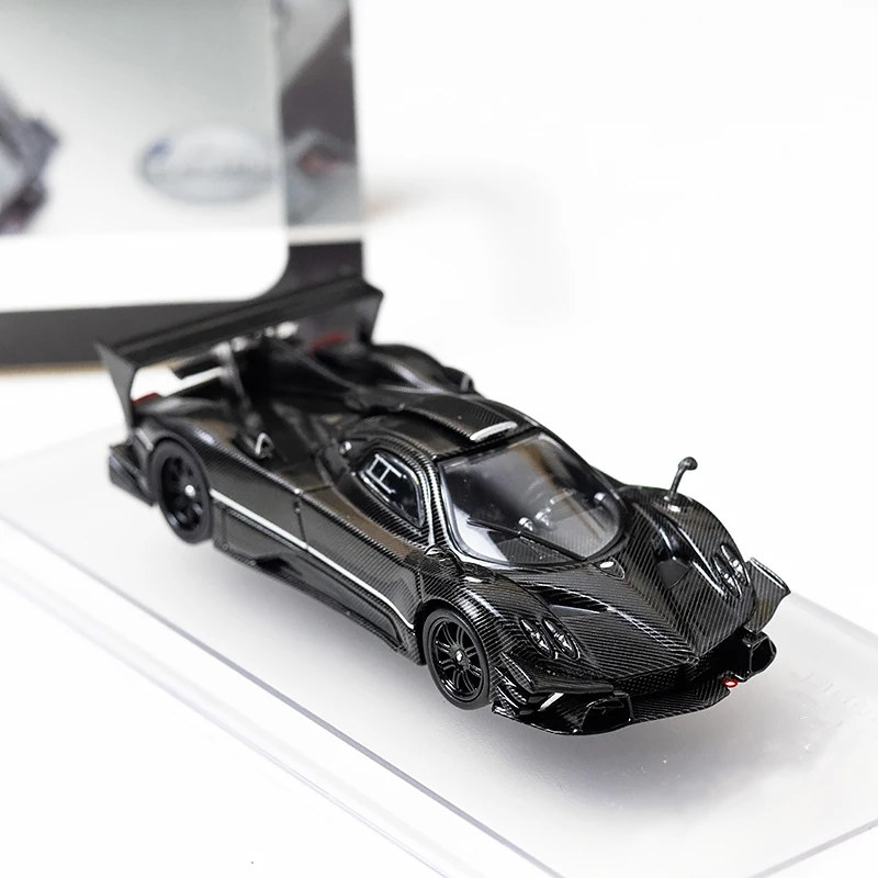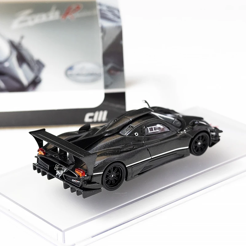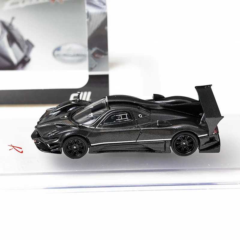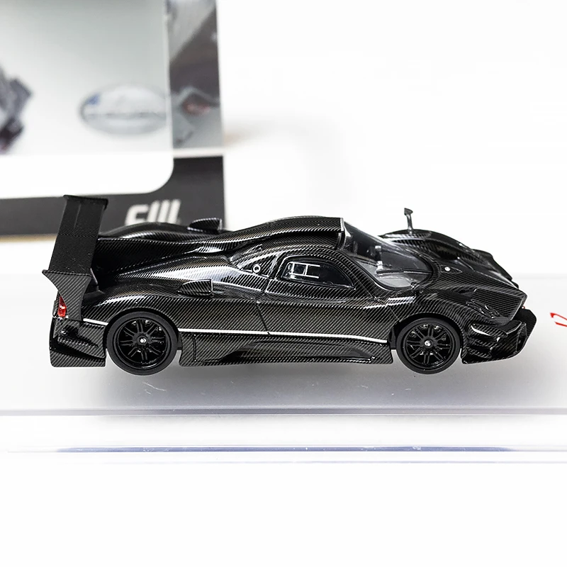 Experience the stunning craftsmanship of the diecast Pagani Zonda Revolución model, expertly scaled at 1:64. This striking model features a sleek black body crafted from all-carbon alloy, showcasing a textured finish that mimics genuine carbon fiber. Its aerodynamic contours, sharp angles, and distinctive angular headlights emphasize its high-performance allure. A prominent grille and a large rear wing enhance its sporty design while the intricately detailed black wheels add to its authenticity. Displayed on a clear plastic base for a full 360-degree view, this meticulously crafted car is perfect for collectors and enthusiasts alike, bringing a piece of automotive excellence to your collection.