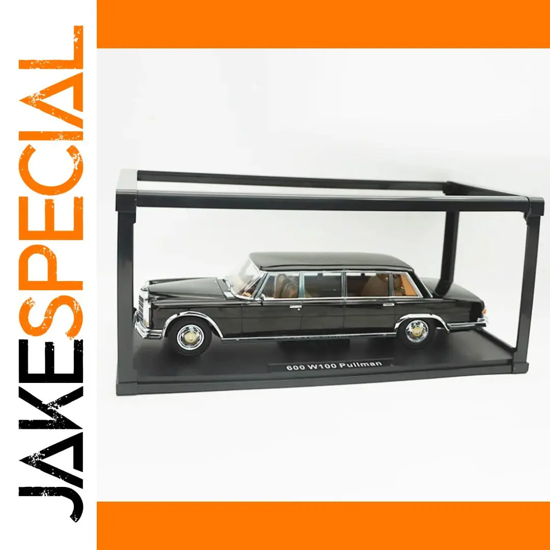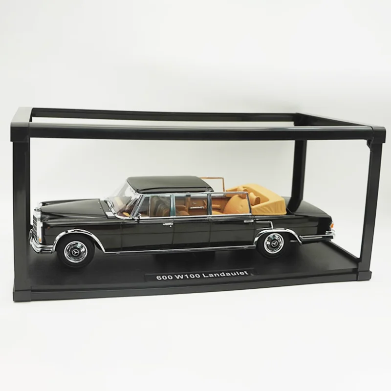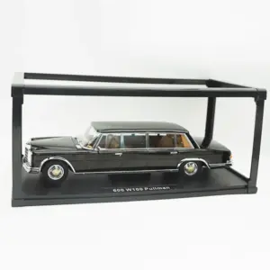 Immerse yourself in the elegance of this highly detailed, diecast 1:18 scale replica of the Pullman W100 extended edition. Crafted from alloy, this static display model captures the classic luxury sedan’s sleek, boxy silhouette with a smooth, glossy black finish that reflects light beautifully. The model features chrome accents around the wheel arches, bumpers, and window frames, adding a sophisticated touch. Precise body lines run along the length, emphasizing craftsmanship and authenticity. The clear windows reveal an interior with a refined tan or beige palette, contrasting tastefully with the exterior. The layered front grille and metallic hubcaps contribute to the collectible's luxurious and authentic appearance, perfect for adding to your collection or display.