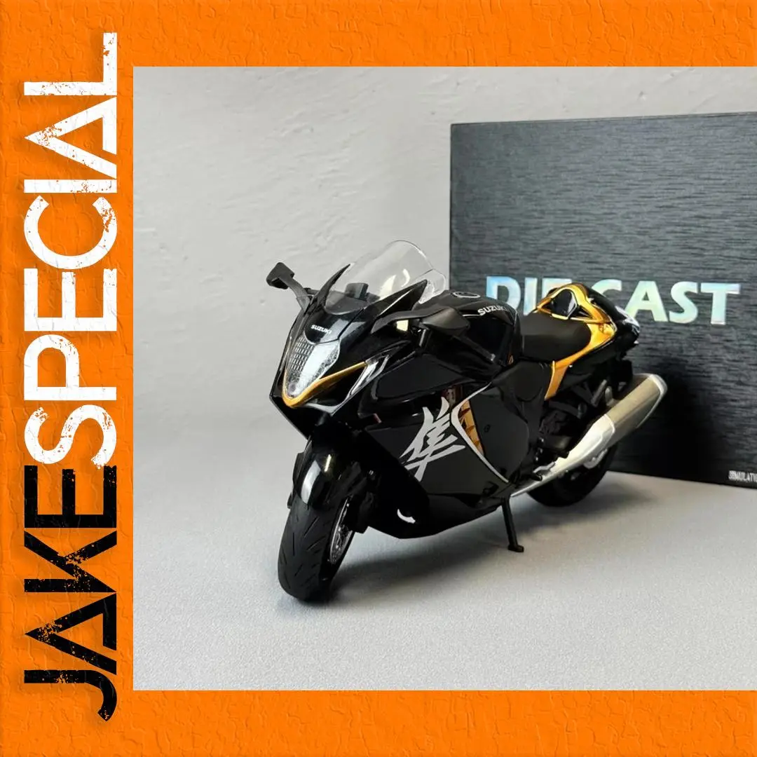 This highly detailed 1:9 scale diecast Suzuki Hayabusa GSX-1300R motorcycle model is crafted from metal, offering an authentic and sleek design perfect for collectors and enthusiasts. It features a striking black finish accented with gold and silver details, including a transparent curved windshield, intricately designed rectangular headlight with a clear lens, and stylized white flame-like graphics on the fuel tank. The model includes functional sound and lighting effects, realistic black tires with tread patterns, silver spokes, and a smoothly rounded rear cowl with gold accents. Suitable for display as a hobby ornament or decorative collectible, it’s an impressive, finely crafted piece with no batteries required.