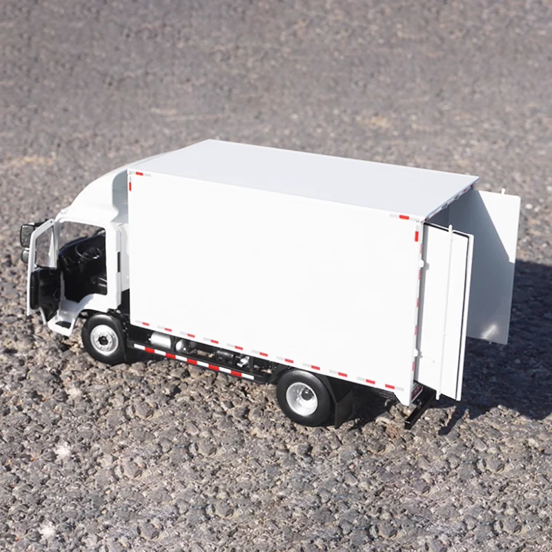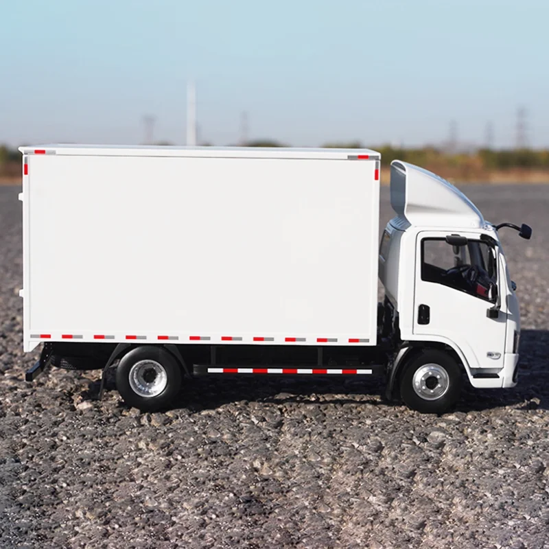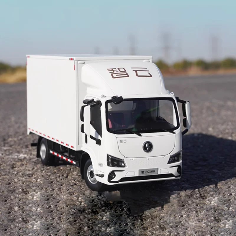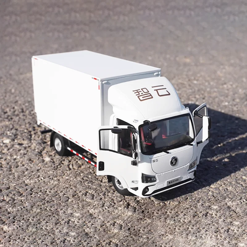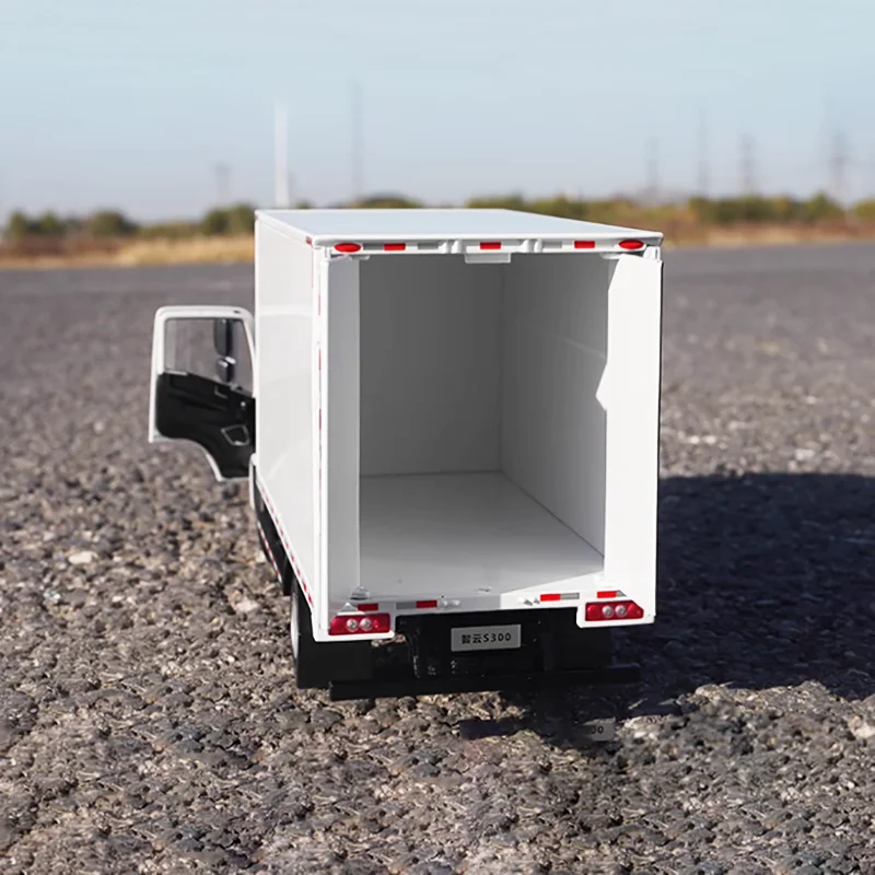 Discover a highly detailed 1:22 scale alloy replica of the Zhiyun S300 hybrid light truck, measuring approximately 25cm long, 11.5cm wide, and 13.5cm tall. This finished, static collectible model showcases realistic features, including a shiny metallic surface, white cab with black side mirrors, and an enclosed cargo area accented with reflective red and white tape. The model’s intricate design includes angular headlights with clear lenses, detailed silver rims on textured black tires, and subtle panel lines that enhance its lifelike appearance. Crafted from durable alloy, this premium display piece is perfect for adult collectors seeking to add a sophisticated, conversation-starting model to their collection.