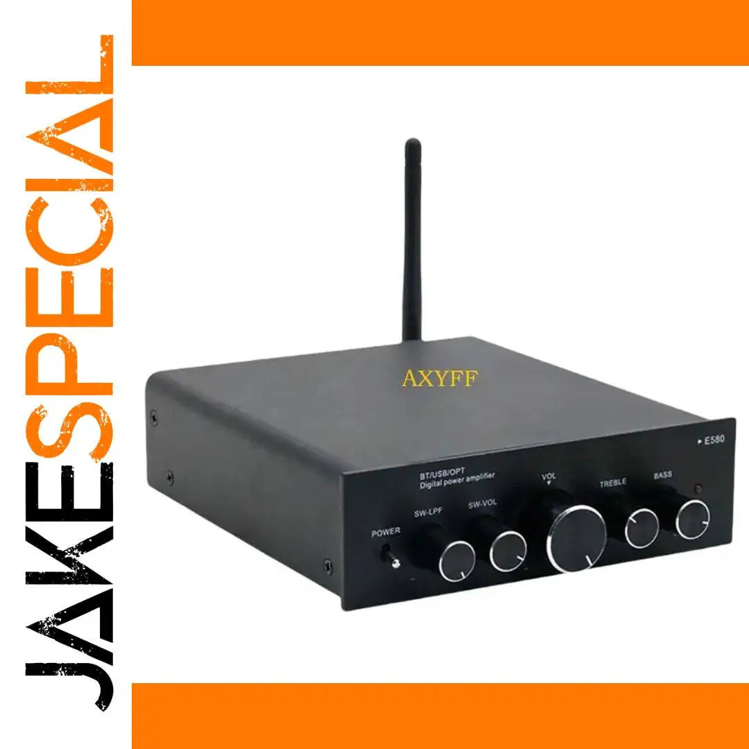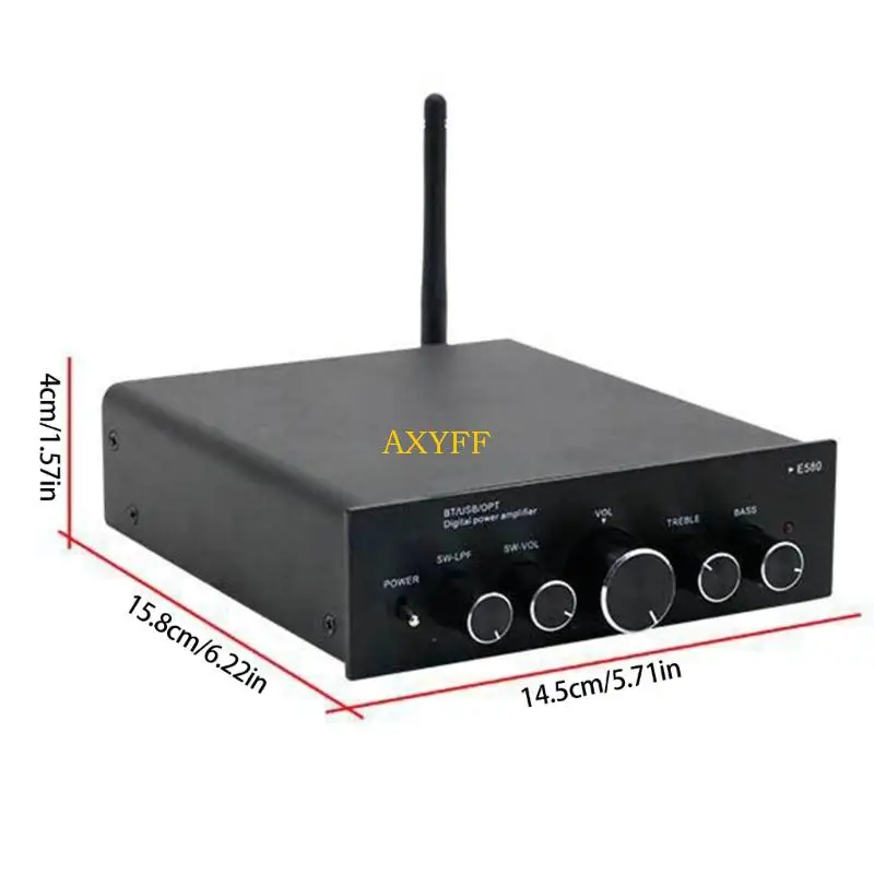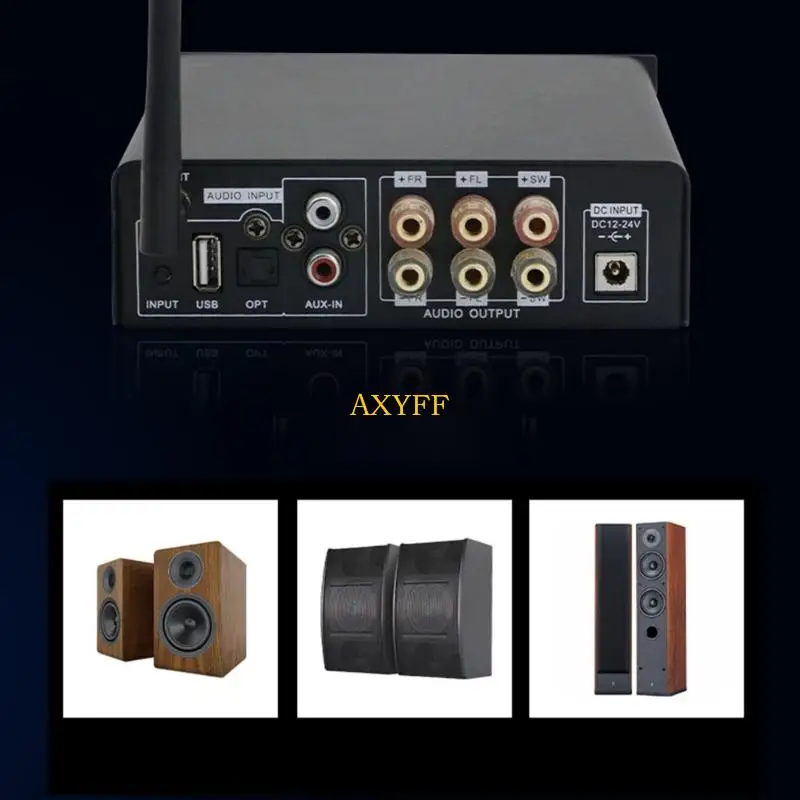 Imagine elevating your audio experience with this sleek, modern digital amplifier. Its minimalist rectangular aluminum design combines durability with contemporary style, perfect for any home or studio. The flat, smooth top surface, accented by the bold yellow “AXYFF” brand name, adds a vibrant touch. On the front panel, you'll find a simple layout of control knobs, including a large central volume control and smaller treble and bass adjustments, all within easy reach. The black antenna hints at Bluetooth capabilities, letting you stream your favorite music wirelessly. The matte finish reduces fingerprints and glare for a clean look. This amplifier’s professional appearance seamlessly blends functionality and elegance, making it an ideal centerpiece for immersive sound systems.