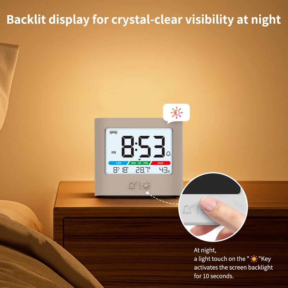 - Adjustable backlight for optimal visibility during nighttime, plus icons for humidity and temperature alerts.