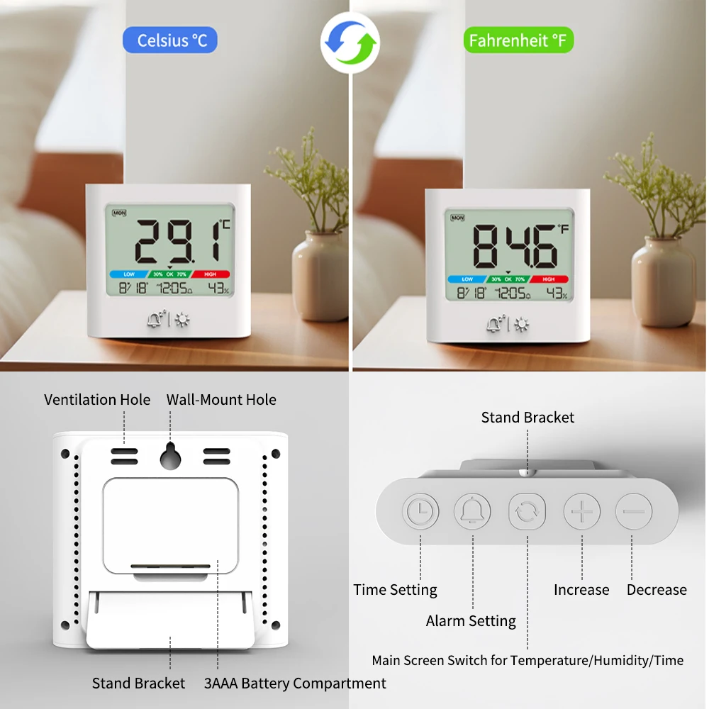 - Built-in thermometer (-10°C to 60°C) and hygrometer (10% to 99%) to monitor indoor air quality accurately.