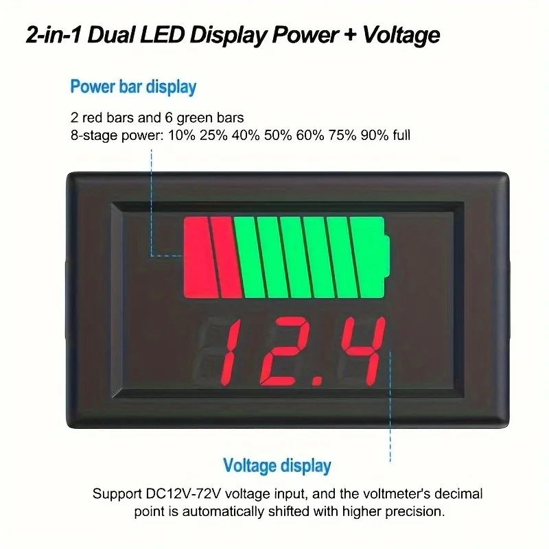 Enhance your vehicle’s battery monitoring with this sleek, compact charge level indicator, supporting 12V, 24V, 36V, 48V, and 60V systems. Featuring a modern black matte casing, it displays precise voltage readings on three 0.56-inch LED digital tubes with vivid red and cool blue color options. The device uses a clear power level indicator with two red bars and six green bars, visible even in bright environments. With dimensions of 48mm x 29mm x 22mm and a 46mm x 27mm cutout, it easily fits into dashboards and panels. Operating on 6-24V DC, it’s perfect for lithium or lead-acid batteries and designed for simple, polarity-sensitive wiring to keep your battery status accurate and accessible at a glance.