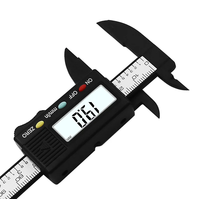 Experience accurate measurements with this sleek, modern digital caliper designed for precision and ease of use. Its slim black body with metallic accents offers a contemporary look, complemented by a large, clear LCD display that shows measurements of 23.5 mm in crisp black digits. The device features finely marked graduations up to 100 mm, with unit switching between inches and millimeters via a blue button. Bright accent buttons in yellow and red enhance usability, making measurements quick and straightforward. In your hands, this lightweight caliper, weighing just 32 grams and made of durable plastic fiber, becomes an essential tool for jewelry making, small object measurement, or technical projects. Its ergonomic design ensures comfortable handling for detailed work.