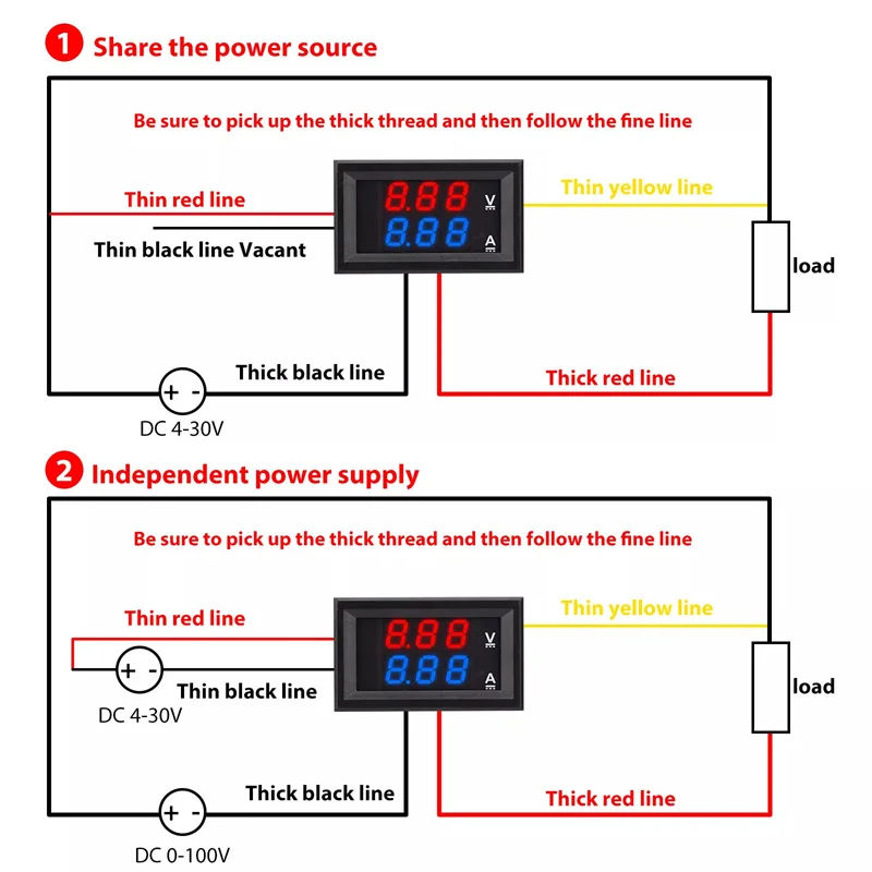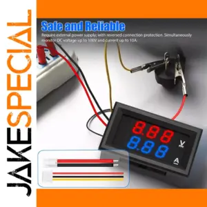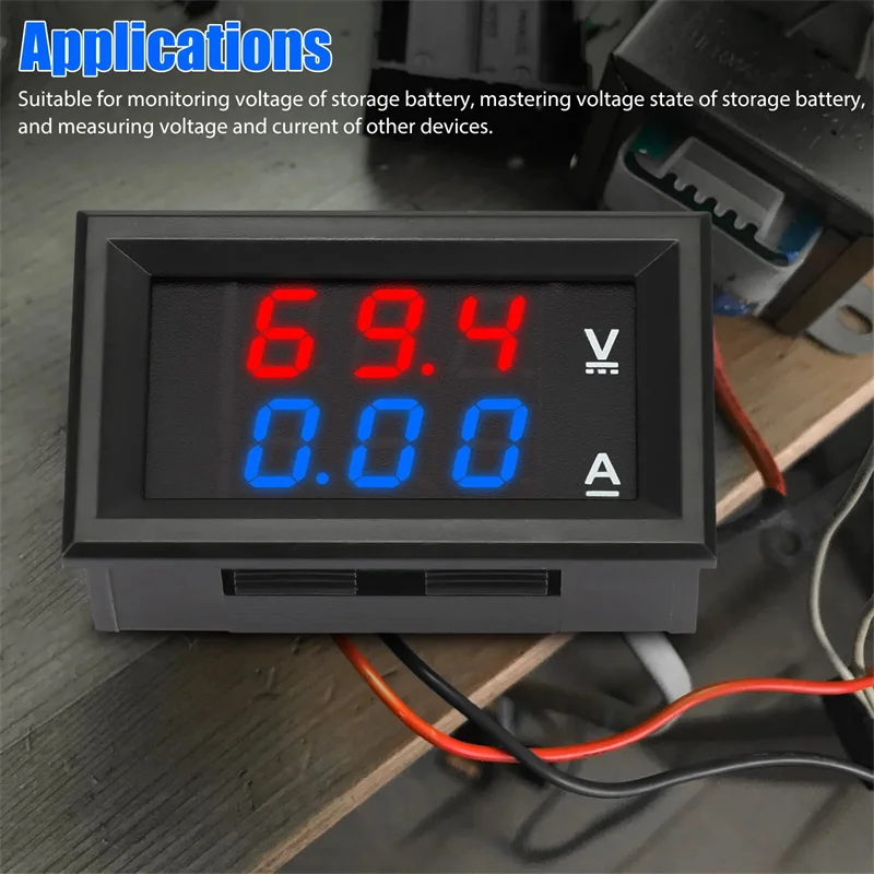 This compact digital voltmeter and ammeter measures DC voltage up to 100V and current up to 10A with high precision, featuring auto-ranging accuracy of ±1% for voltage and ±0.1% for current. Its sleek black housing houses a vibrant 0.28-inch dual LED display—red for voltage and blue for current—allowing simultaneous, easy-to-read readings. Designed for versatility, it includes reverse connection protection and operates within -10°C to 65°C. With dimensions of 48 x 29 x 21 mm and a mounting hole size of 46 x 27 mm, it is ideal for monitoring storage batteries and other DC devices, making it a reliable tool for technical enthusiasts.