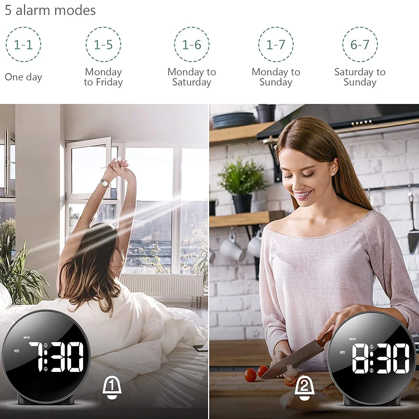 - Supports multiple alarm modes, including daily, weekday, or weekend settings, with a 5-minute snooze function for a flexible wake-up experience.