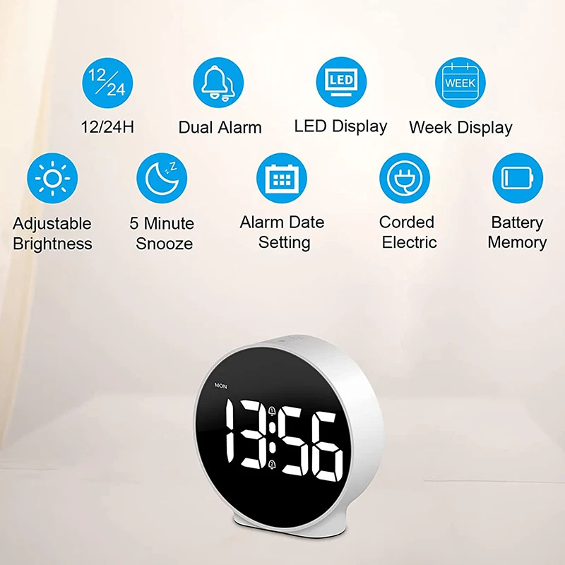 Experience the perfect blend of style and functionality with this sleek digital alarm clock. Featuring a 100mm diameter high-definition LED display, it offers clear visibility of the time and calendar at any angle. Its minimalist, lightweight acrylic shell creates a contemporary aesthetic, seamlessly fitting into any home or office decor. The clock supports both 12-hour and 24-hour formats, with easy-to-use brightness adjustments, allowing you to tailor the display from full brightness to rest screen mode. Multiple alarm modes, including daily and weekday-specific settings, ensure you wake up on time, while the 5-minute snooze feature offers added convenience. Compact and stylish, this clock is designed for effortless daily use and reliable performance.