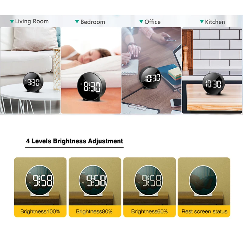 - Adjustable brightness with four levels (100%, 80%, 60%, and rest mode) accessible through the “SNOOZE/LIGHT” button, ensuring comfort during day and night.