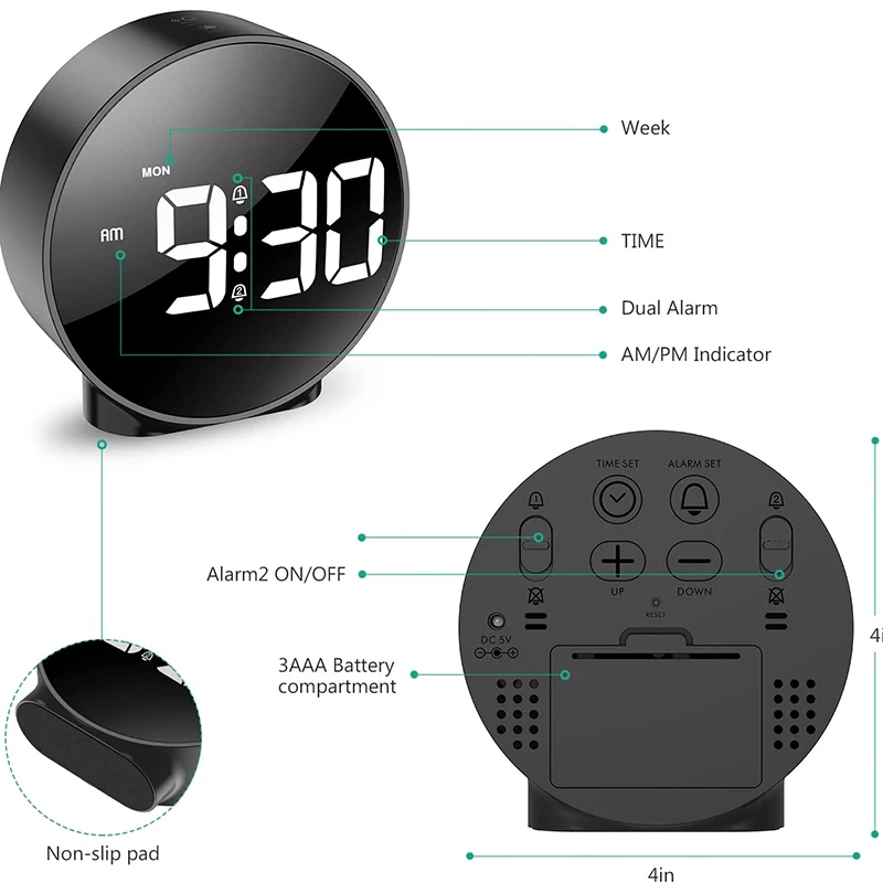 - Large 100mm diameter high-definition LED display for clear viewing from all angles, showing time, date, and alarm indicators with sharp contrast.