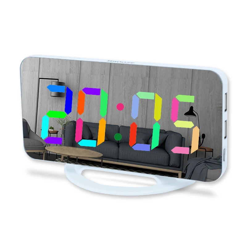 Imagine waking up gently every morning, greeted by a sleek, stylish clock that blends elegance with practical functionality. This modern digital alarm clock features a striking 6.7-inch HD LED display with segmented white digits, ensuring you can easily check the time from across the room. Its reflective mirror surface adds a touch of sophistication and doubles as a mirror when not displaying the time. Designed with versatility in mind, it can stand upright, lie flat, or hang on your wall. With customizable brightness levels and an automatic light sensor, it adapts seamlessly to your environment, providing a comfortable display all day and night. Plus, dual USB ports let you charge your devices effortlessly while staying organized.