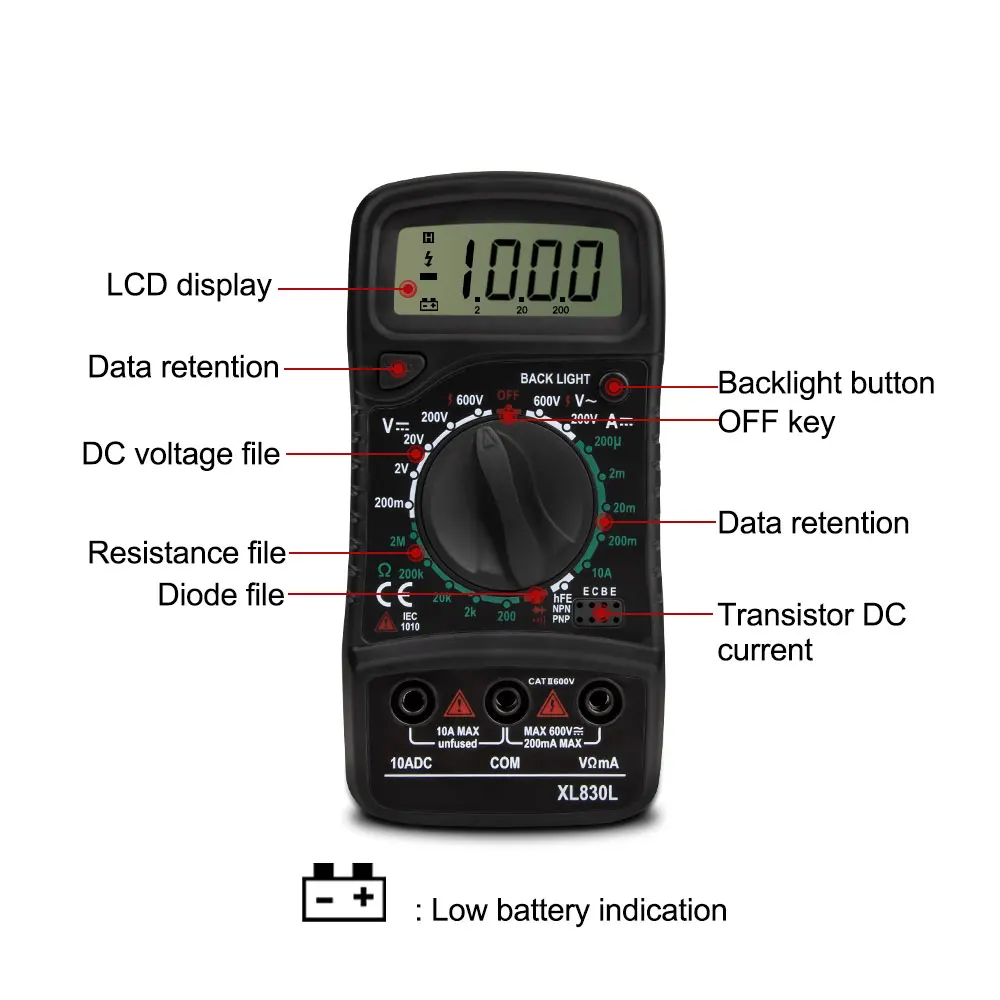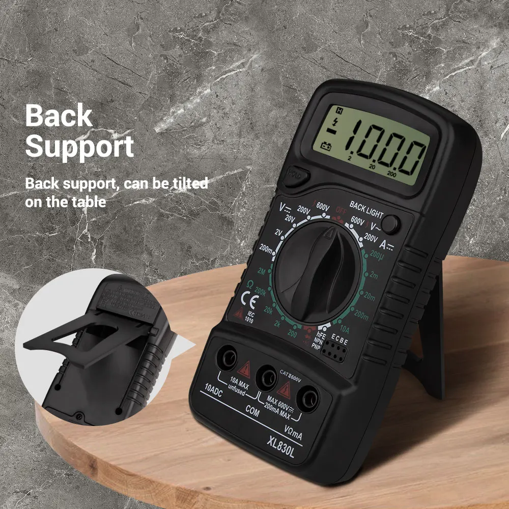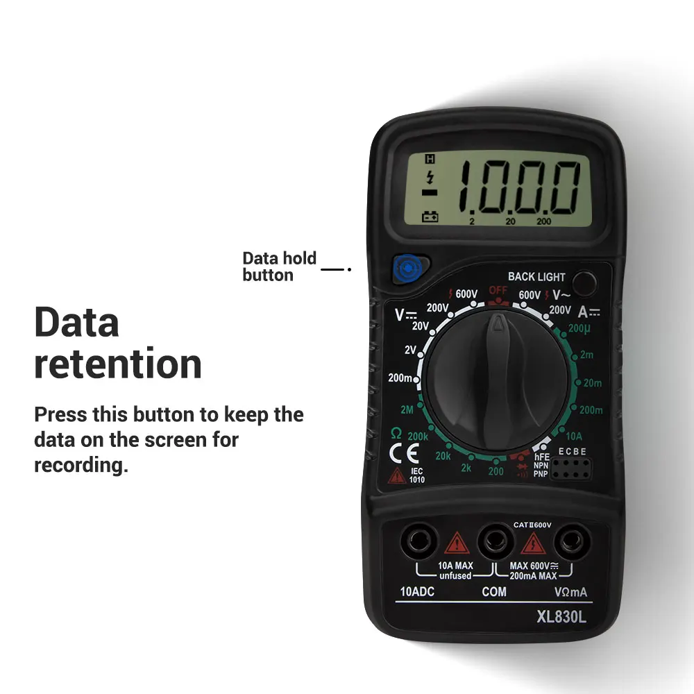 Experience reliable and accurate testing with this sleek, black digital multimeter. Designed for professionals and enthusiasts alike, it features a compact and ergonomic body, measuring 145mm by 70mm by 40mm. The large, backlit LCD display makes reading measurements effortless in any environment, from well-lit workshops to dimly lit spaces. The intuitive interface includes a 20-position rotary switch for precise selection between functions, while essential buttons like HOLD and backlight are seamlessly integrated. Whether you're measuring high voltages or testing resistances, ease of use is front and center. Its sturdy design delivers dependable performance, making it your essential tool for electrical troubleshooting and maintenance tasks.