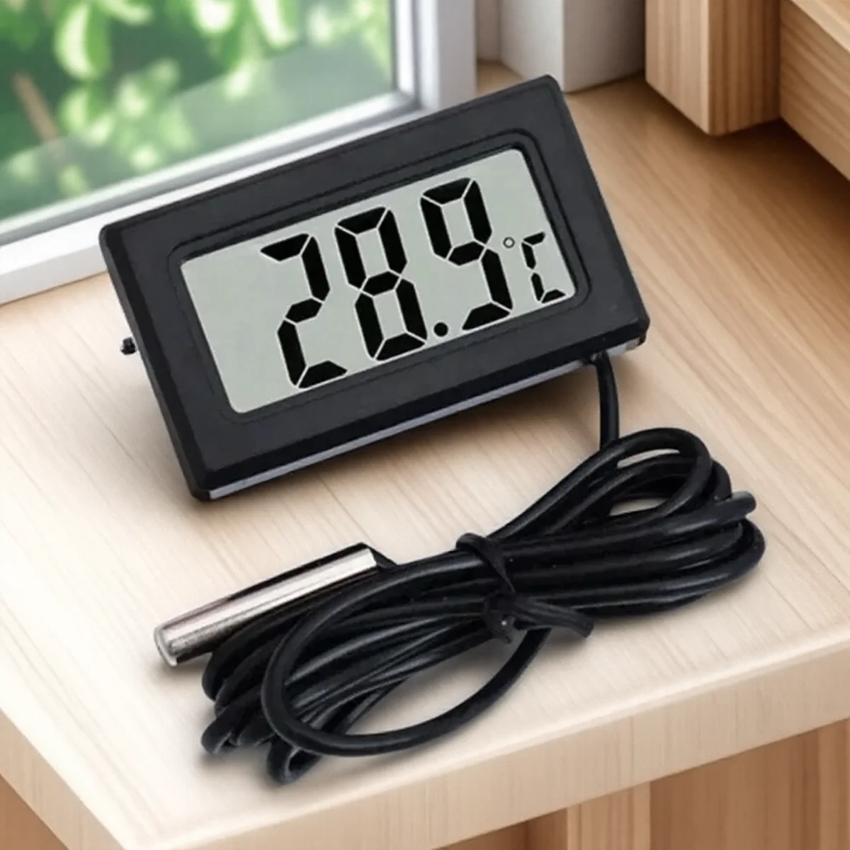 Experience reliable temperature monitoring with this stylish digital refrigerator thermometer. Designed for efficiency and accuracy, it features a modern, compact rectangular shape with a matte black casing for a sophisticated look. The large LCD display ensures easy reading of temperature data from -50°C to +110°C with a fine resolution of 0.1°C and an accuracy of ±1°C. Its long, flexible stainless steel probe connected via a black or white cable allows versatile placement in refrigerators, freezers, or water tanks. Powered by two LR44 batteries included, the device’s moisture-resistant and anti-interference design guarantees consistent performance even in harsh conditions. Its sleek size (48mm by 28mm by 15mm) makes it an unobtrusive yet essential tool for maintaining optimal environments.