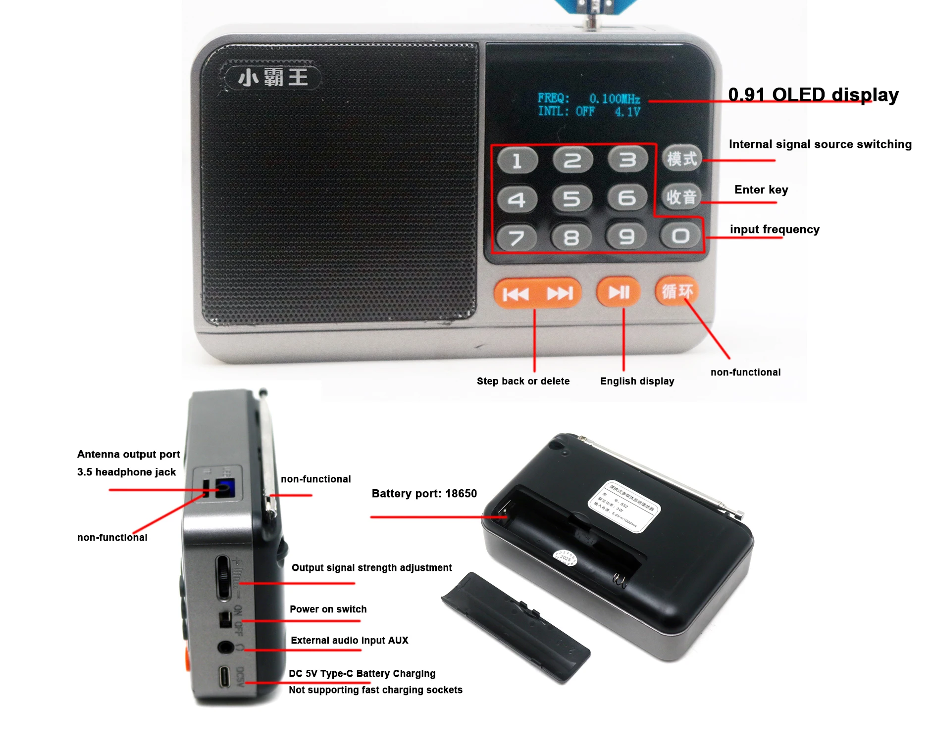 Experience precise radio frequency testing with this advanced 4-band digital signal generator. Covering frequencies from 100-525kHz (LW), 400-1700kHz (AM), 1.7-30MHz (SW), and 76-108MHz (FM), it features standard IF signals at 455kHz, 465kHz, and 10.7MHz, with internal modulation tones of 400Hz, 1000Hz, 2000Hz, 5000Hz, and 10000Hz. Powered by a built-in 18650 battery with a Type-C charging port (5V only), it offers high stability with digital PLL technology. The OLED display ensures clear readings, while Bluetooth connectivity and external input support versatile audio options. Compact, portable, and ideal for radio repair, calibration, and testing.