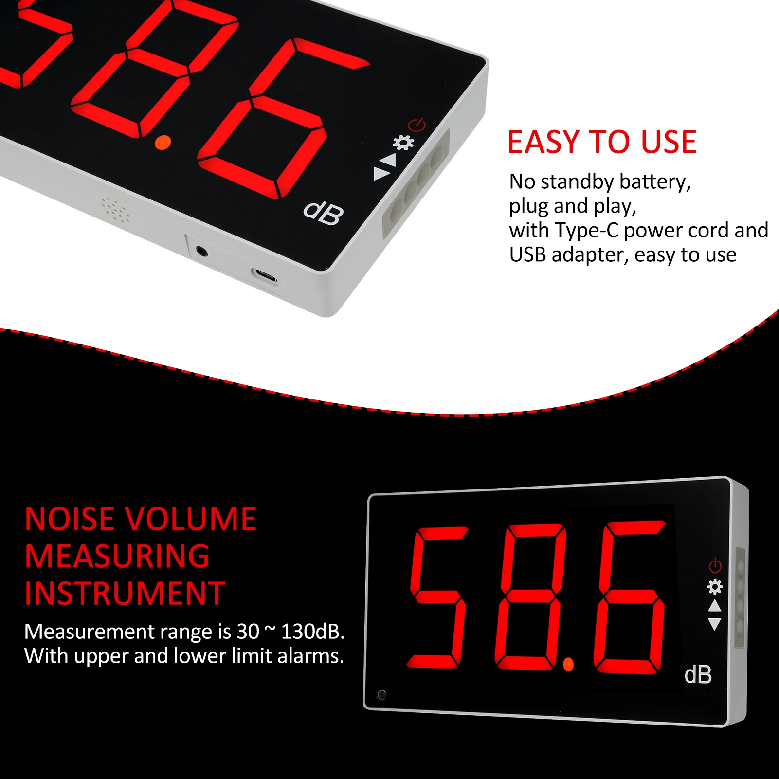 - Large LCD display with bright red LEDs for clear, immediate readings in any environment. The horizontally-oriented screen provides high visibility for accurate noise measurement at a glance.