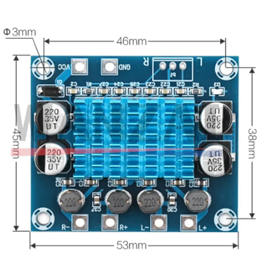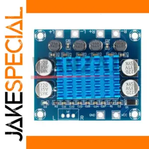 Experience powerful, high-quality sound with this compact digital stereo amplifier featuring the TPA3110 chip. Measuring just 53mm by 45mm with a slim 14mm profile, it easily fits into various audio projects and enclosures. The striking blue heatsink, with its structured ridges, not only adds a modern aesthetic but also ensures effective heat dissipation. Surrounded by quality metallic components, including shiny silver capacitors and gold-plated terminal blocks, this board combines functionality with an industrial-chic design. Designed for versatility, it delivers 30W per channel (total 60W) into 4-8 ohms speakers, making it ideal for custom audio setups, portable speakers, or DIY sound systems. Its compact size and technical precision make audio enhancement effortless and reliable.