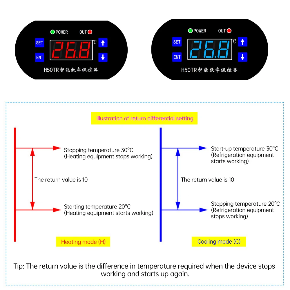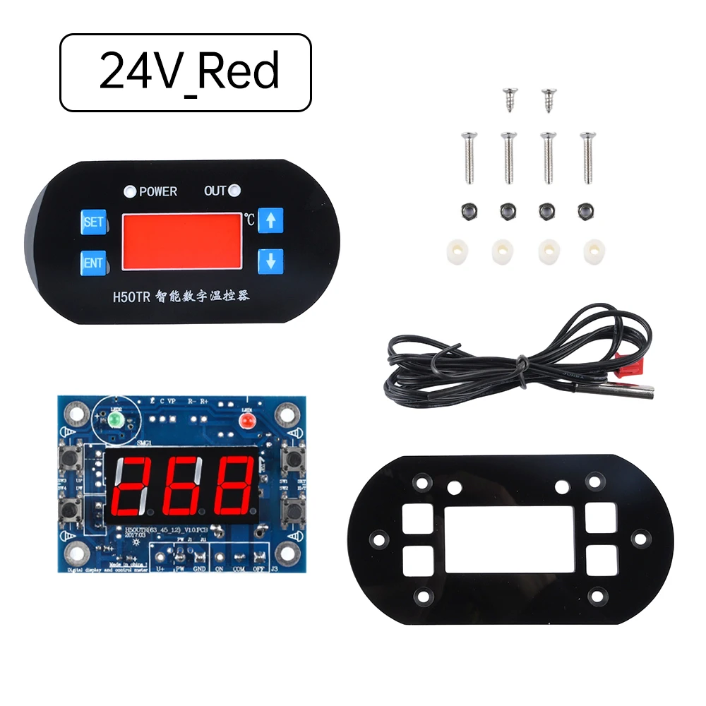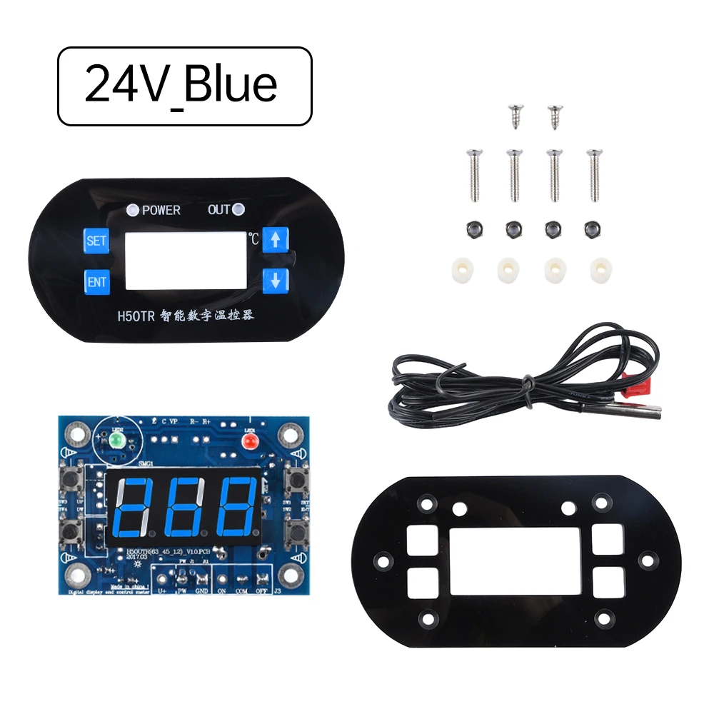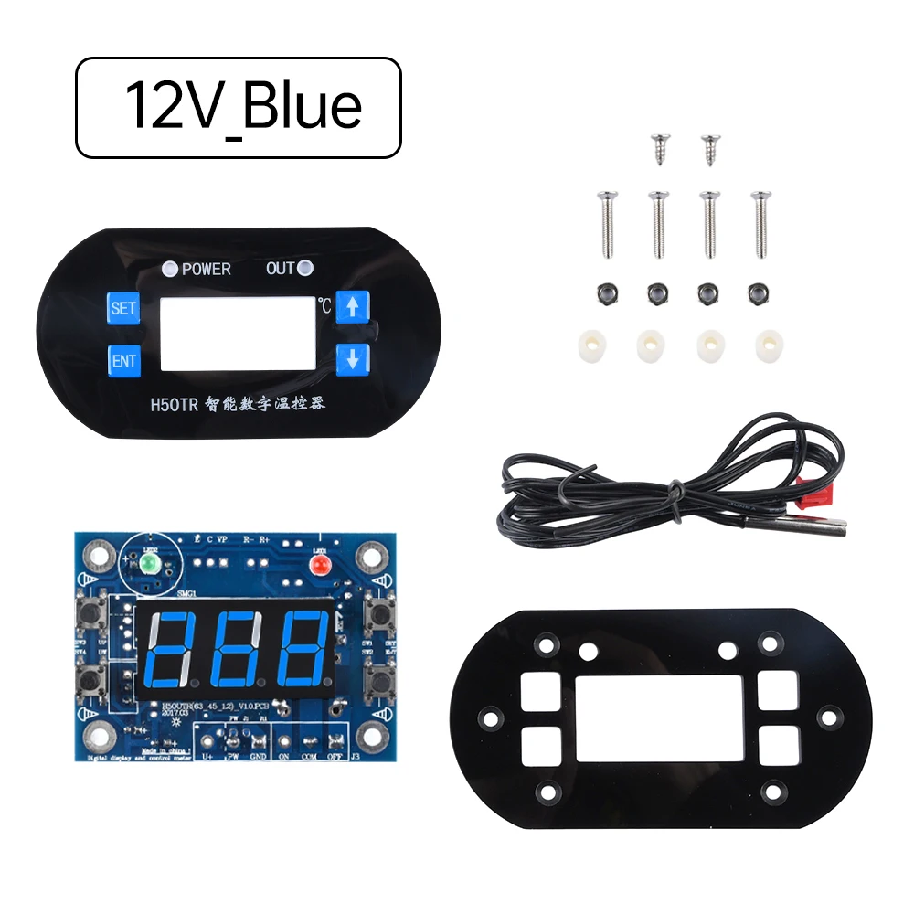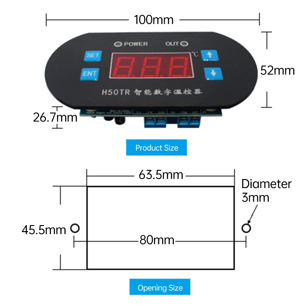 Experience precise temperature control with this DC 12V/24V NTC digital thermostat, featuring a -40°C to 300°C range and accurate to 0.1°C. Equipped with a waterproof NTC 10K probe and a 1-meter cable, it ensures reliable measurements for industrial, incubation, and air conditioning applications. The sleek black rectangular faceplate measures approximately 100mm by 52mm, with an opening size of 63.5mm by 45.5mm for easy panel installation. Its microcontroller-based system manages heating and refrigeration with a relay output rated for up to 10A. The digital display, in vivid red and blue, offers clear monitoring, while adjustable heating and cooling modes provide versatile control for professional use.