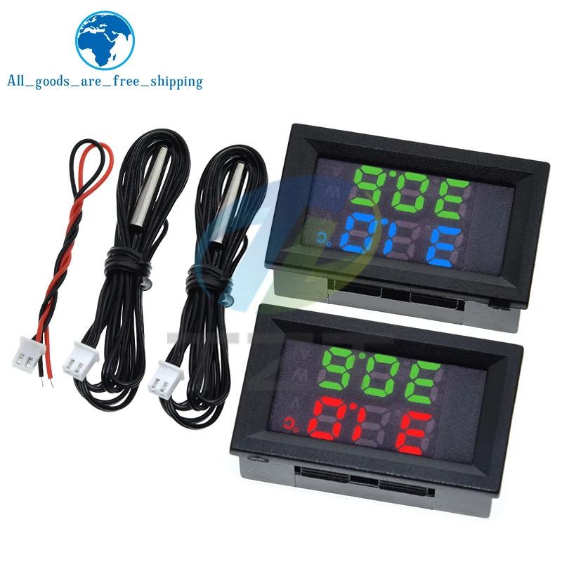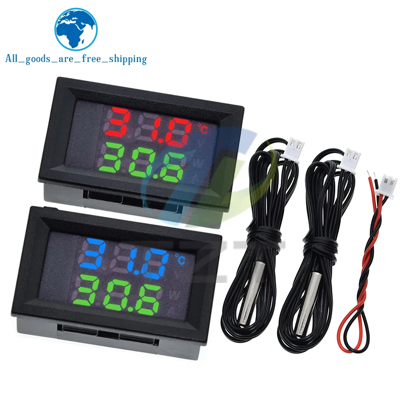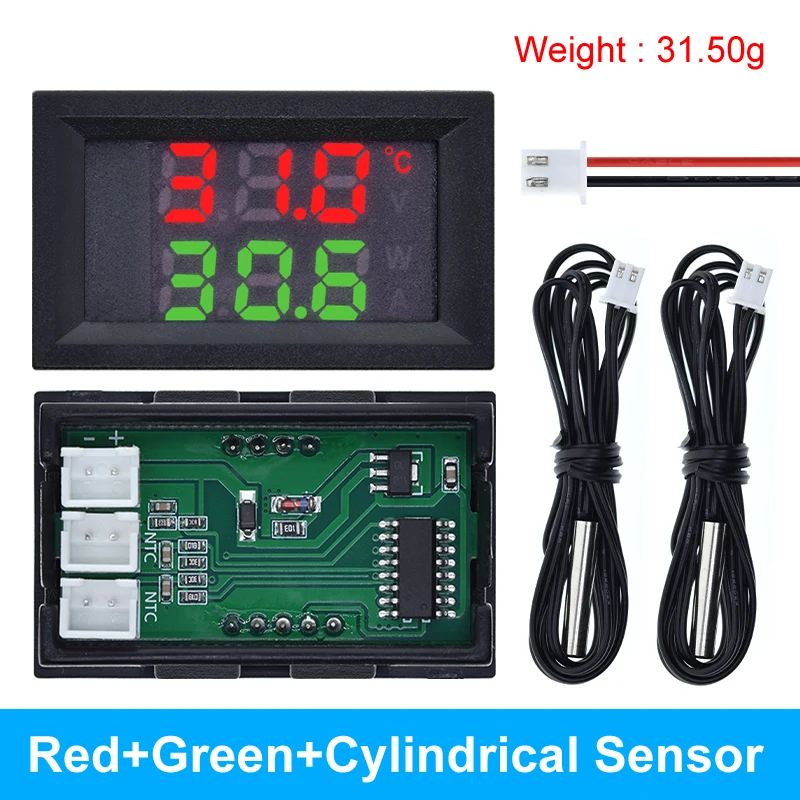 Immerse yourself in precise voltage and temperature monitoring with this sleek digital voltmeter and thermometer kit. Featuring a modern rectangular LED display with a black frame and transparent cover, the device boasts high-contrast digits for easy reading. The top row displays bright red numerals, showing voltage from 4V to 30V DC, while the bottom row presents crisp blue digits indicating ambient temperature using an NTC 10K 3950 thermistor probe. The 100cm black cables with white connectors ensure flexible installation in various setups, perfect for computer systems or voltage regulation projects. Its minimalist, organized circuit board with a green solder mask enhances durability and ease of use. Choose from vibrant red-blue, red-green, or blue-green color schemes to match your style or system.