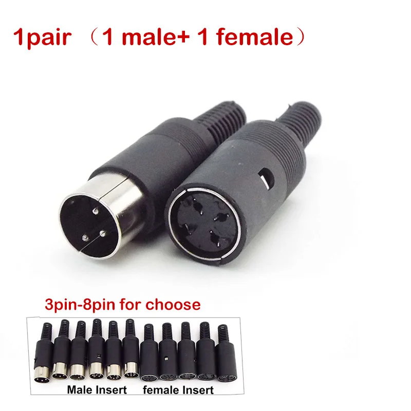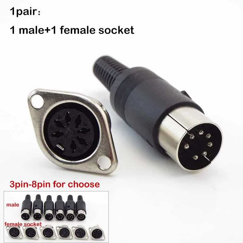 Experience seamless power and signal connections with this high-quality DIN connector set. Crafted with precision and durability in mind, these connectors feature a sleek black plastic male plug and female socket, designed for easy soldering and secure mounting on panels, keyboards, or chassis. Available in 3, 4, 5, 6, 7, or 8-pin configurations, you can choose between single pairs or a set of five pairs, perfect for versatile applications. The male plugs have ribbed grips and threaded rear sections for secure installation, while stainless nickel-plated shields offer added grounding and shielding. The minimalist, industrial aesthetic complements any technical setup, making them ideal for professionals seeking robust and reliable connectors for power or signal transfer.