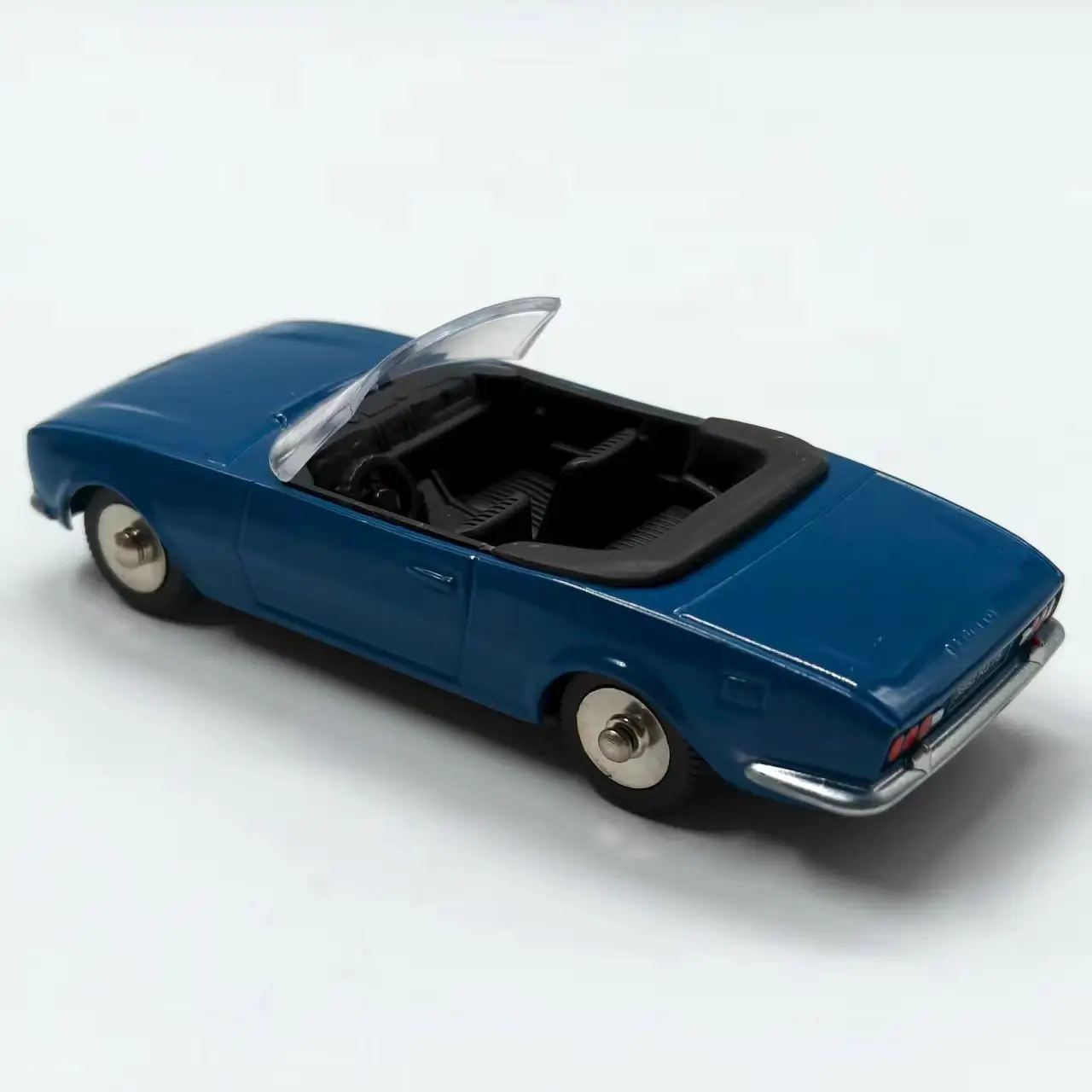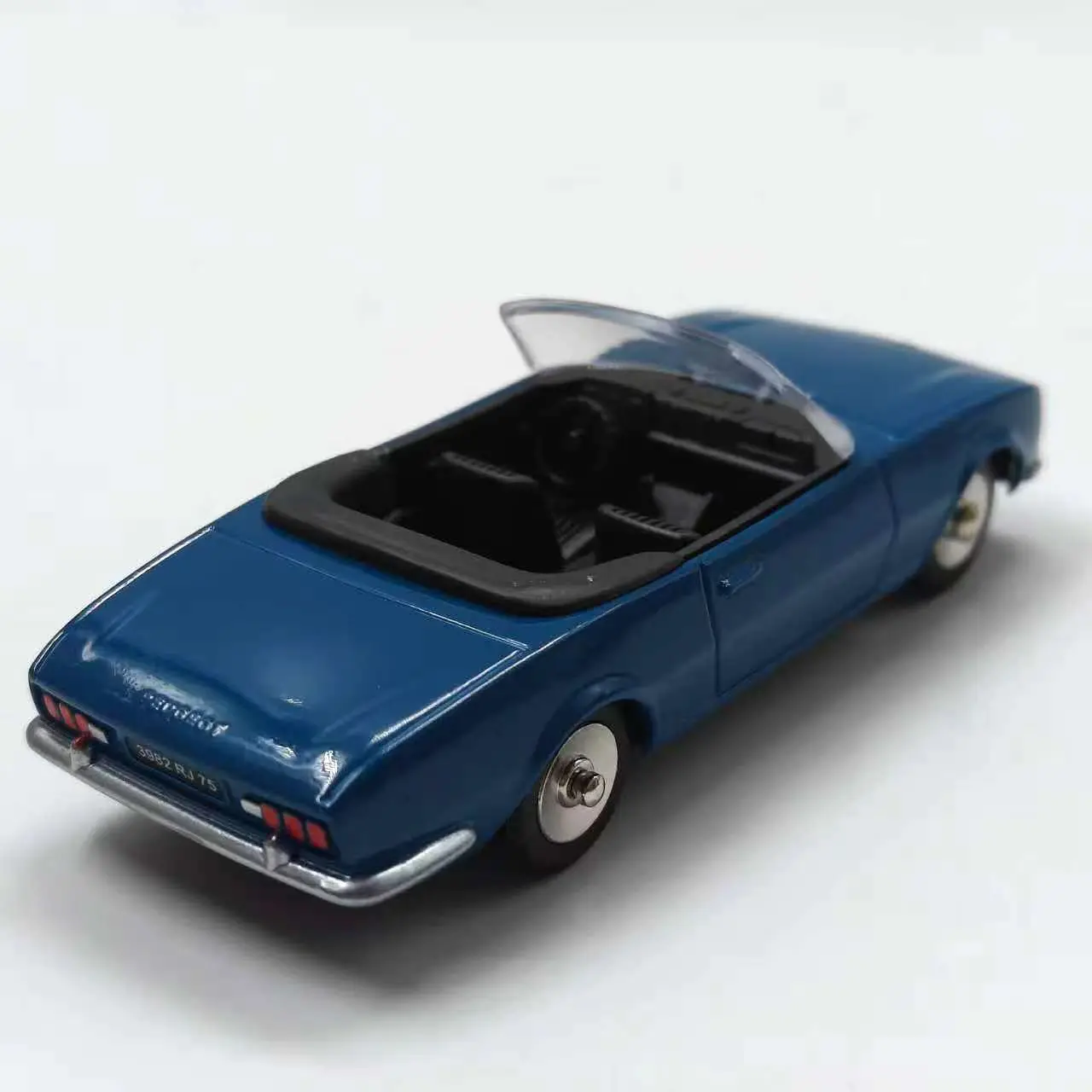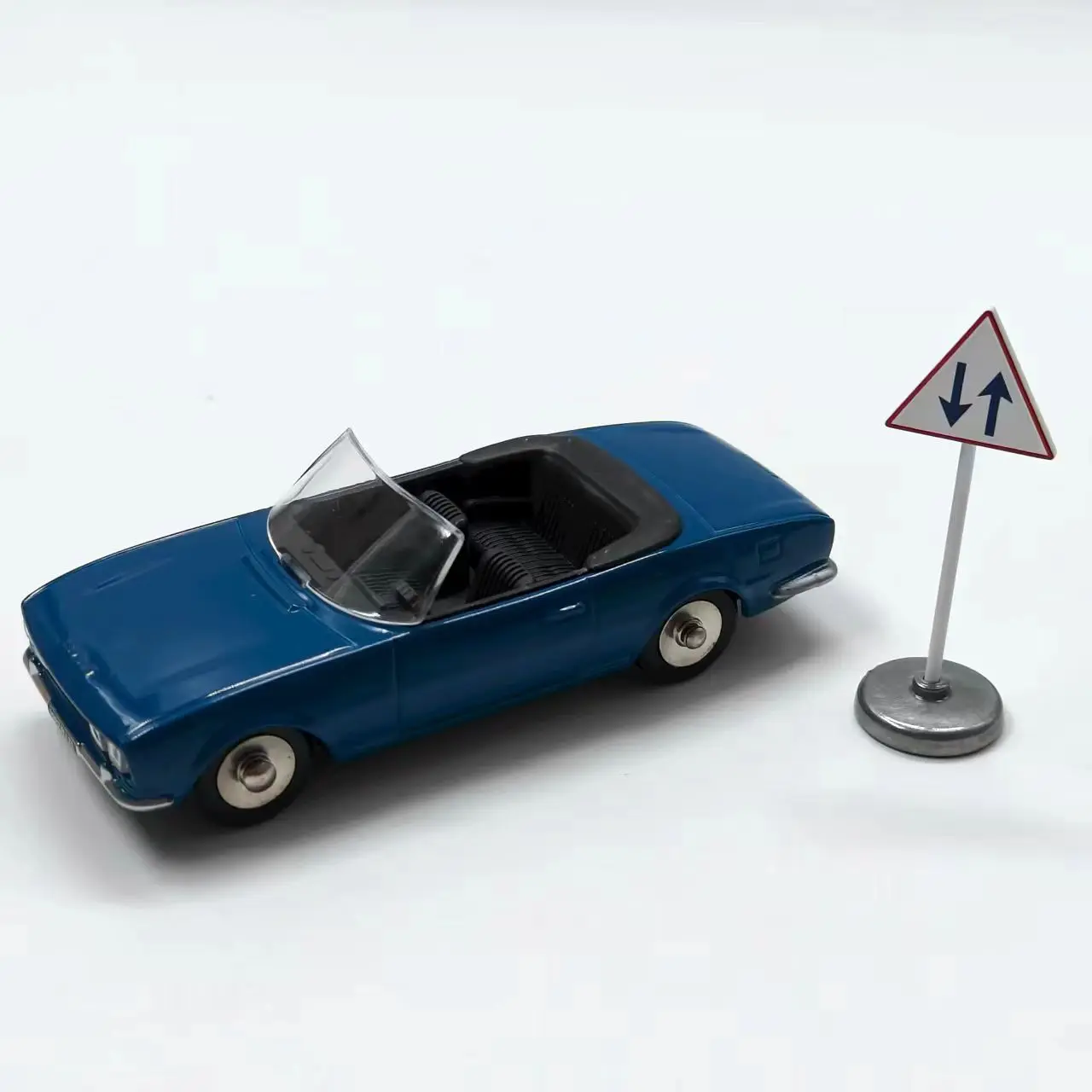 The DINKY TOYS 1:43 scale model of the Peugeot 504 Cabriolet is a captivating blend of authentic design and exquisite detail. Showcasing a striking glossy blue exterior, this diecast model captures the classic essence of the original vehicle with its smooth lines and rounded edges. The clear windshield reveals a beautifully crafted black interior complete with an intricately designed dashboard and seats. Silver alloy wheels with rubber tires enhance its realistic appearance, making it a perfect addition to any collection. Presented atop a vibrant yellow box adorned with an enticing illustration, this model is set to impress collectors and enthusiasts alike.