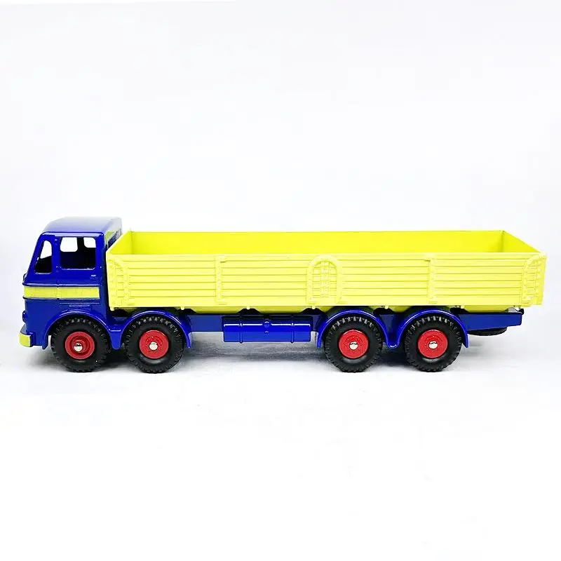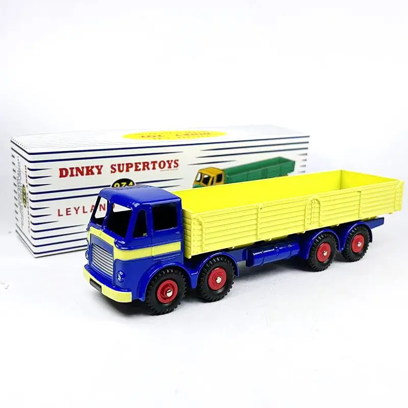The Dinky Toys Leyland Octopus Wagon is a stunning 1:43 scale diecast model, ideal for collectors and hobbyists. Its visually striking blue cabin showcases a shiny polished finish, while the realistic chrome grille and small bumper create an authentic truck appearance. The rear features a vibrant yellow flatbed with a ribbed texture, enhancing its overall aesthetic. Built from a robust combination of alloy and plastic, this model is designed without any electrical components, making it a purely mechanical piece. Each wheel is equipped with a bold red hubcap, adding a delightful contrast to the blue and yellow tones. Perfect for admirers of classic designs, it blends nostalgia with contemporary craftsmanship.